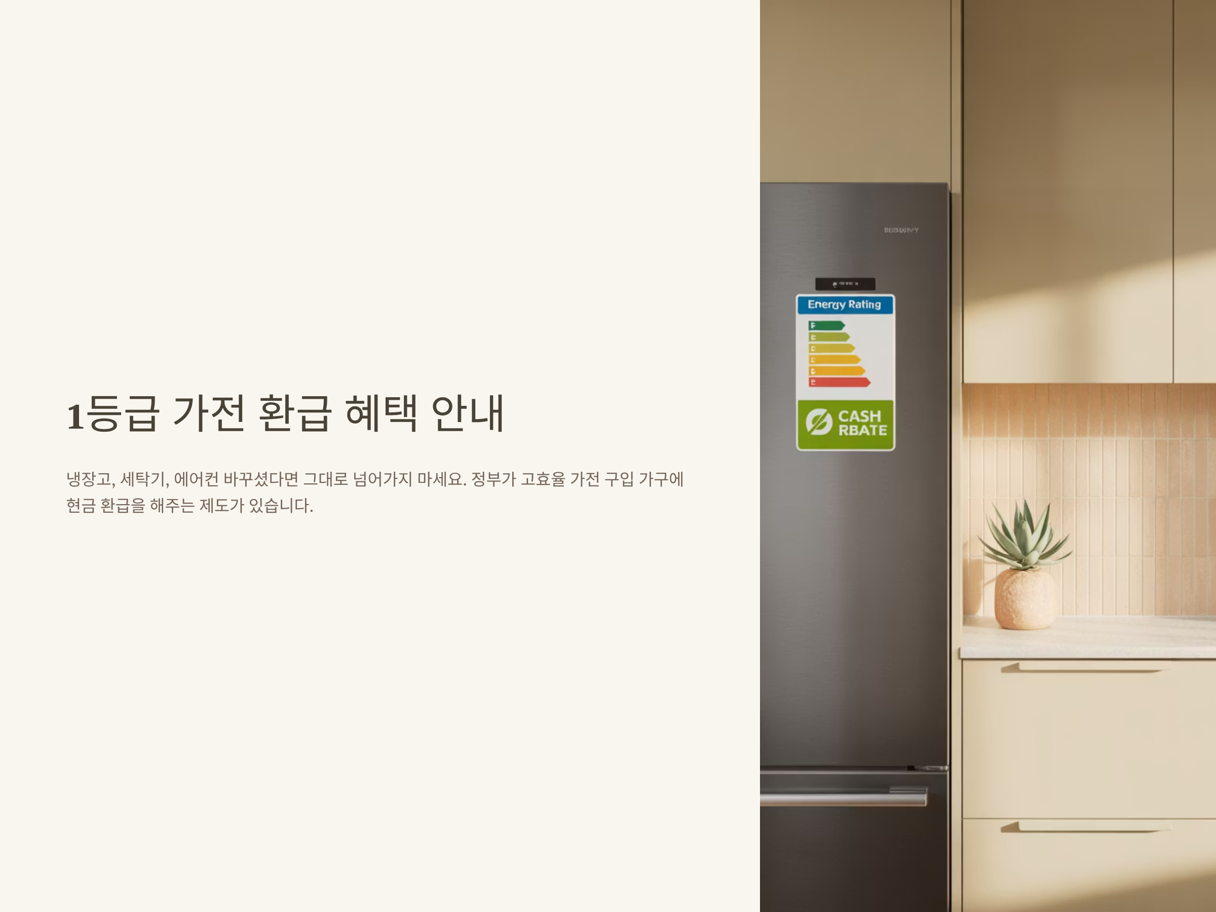 한전 1등급 가전 환급 완벽 정리|다자녀·출산·고효율 가전 환급 신청과 소비전력 기준 공식 가이드한전 1등급 가전 환급 제도는 다자녀, 출산 가구, 일반 소비자 모두 신청할 수 있는 고효율 가전 환급 정책입니다. 복잡해 보이지만, 실제로 경험해보니 꼭 알아야 할 꿀팁이 많았습니다. 이 글에서 한전 1등급 가전 환급, 다자녀 1등급 가전 환급, 출산가구 가전 환급 등 궁금했던 점을 모두 정리해드립니다.한국전력 공식 홈페이지 바로가기고효율 가전 환급 공식 안내 확인하기한국에너지공단 환급 신청 바로가기목차 열기/접기한전 1등급 가전 환급 제도란?신청 대상 및 지원 자격(다자녀·출산가구 포함)환급 대상 가전제품과 소비전력 기준한전 1등급 가전 환급 신청 절차고효율 가전 환급액과 계산 방법자주 묻는 질문(FAQ)..