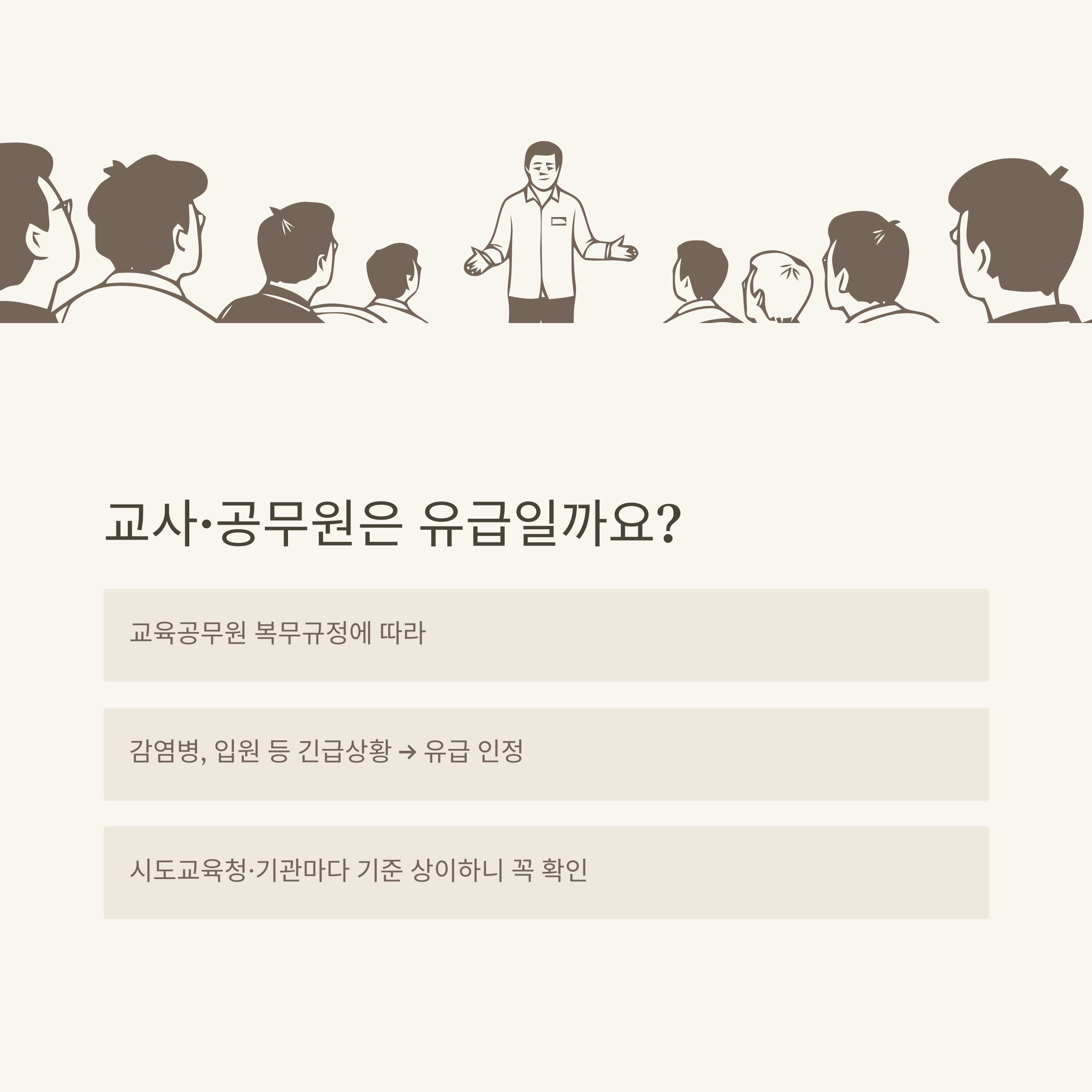 공무원이나 교사분들, 정말 많이 물어보시는 부분입니다. 저도 가족 중 교사가 있어 직접 인사담당자에게 문의했던 경험을 토대로 정리해보면, 교사와 공무원은 교육공무원 복무규정/국가공무원 복무규정에 따라 가족돌봄휴가가 부여되고, 대부분 ‘유급’으로 처리되는 경우가 많았습니다.
