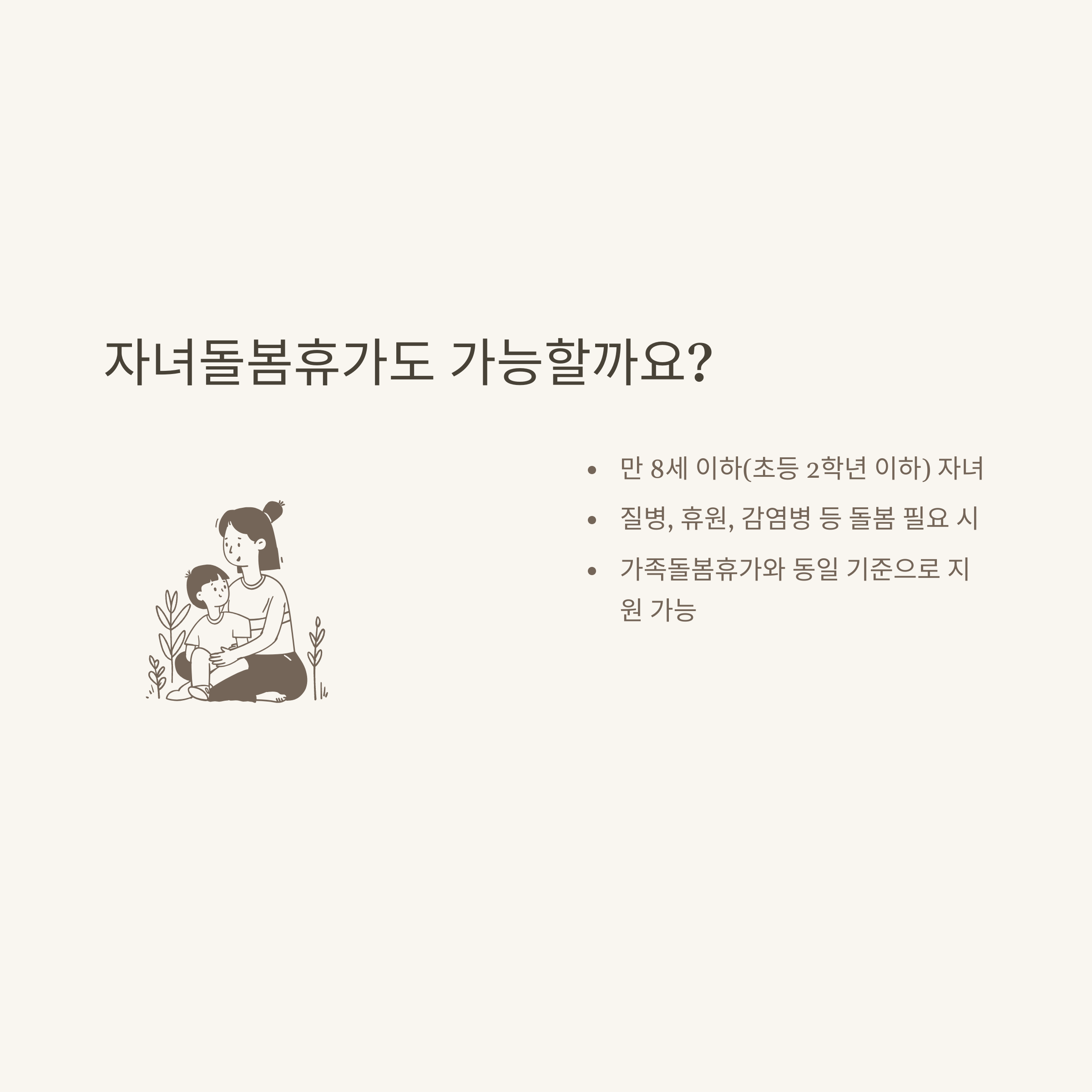 가녀돌봄휴가라는 표현은 잘못된 용어지만, 검색 시 종종 보이기에 참고로 함께 안내드립니다. 실제 신청 시에는 “자녀돌봄휴가”로 통일해서 사용하셔야 합니다. 자녀돌봄휴가는 만 8세 이하(초등 2학년 이하) 자녀의 질병·사고·감염병 등 다양한 사유로 인정됩니다.