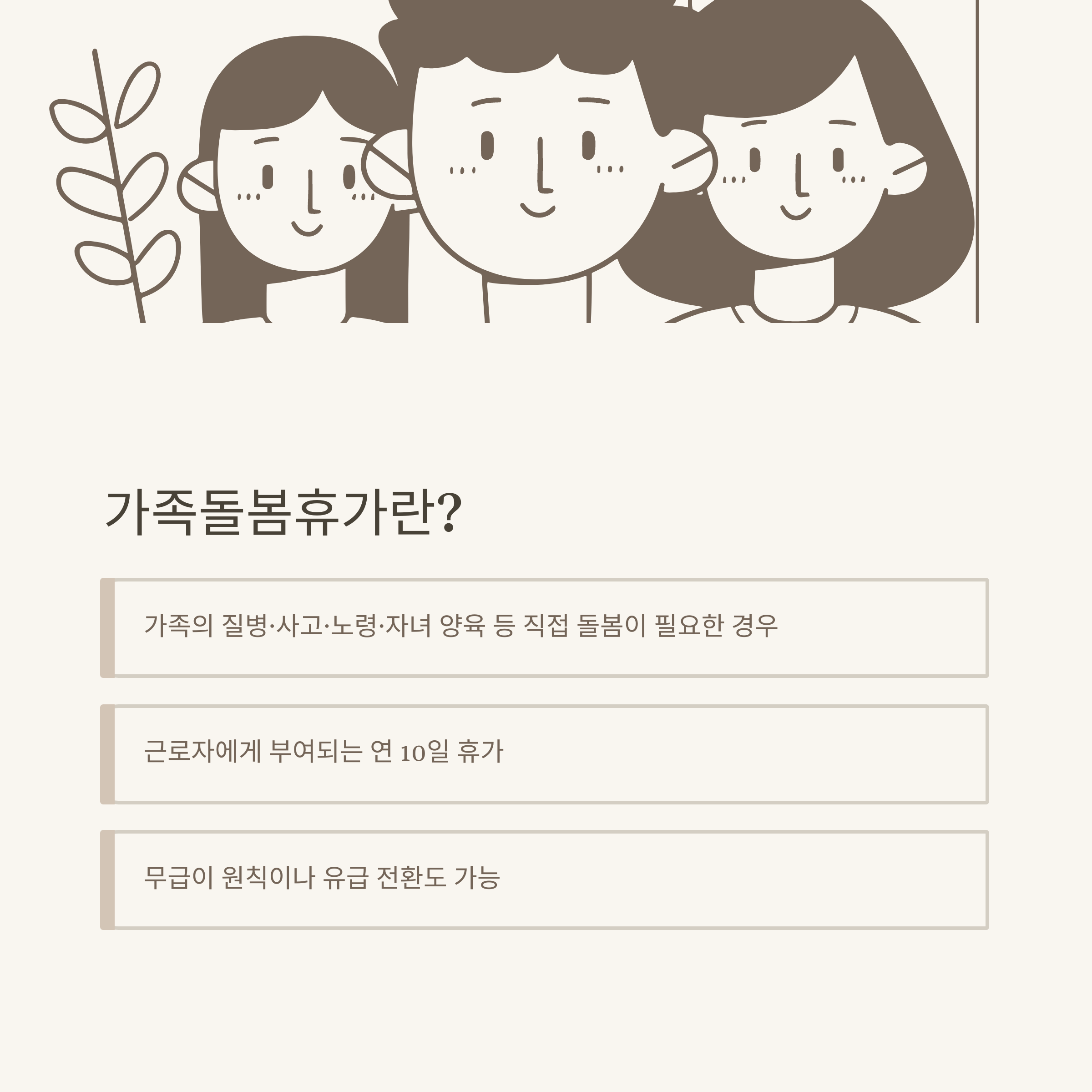 저는 실제로 가족돌봄휴가를 사용하면서 “이게 유급인지, 무급인지”부터 헷갈렸던 기억이 납니다. 가족돌봄휴가란 근로자가 가족의 질병, 사고, 노령, 자녀양육 등 직접적인 돌봄이 필요할 때 사용할 수 있는 휴가로, 연간 10일까지 쓸 수 있습니다.