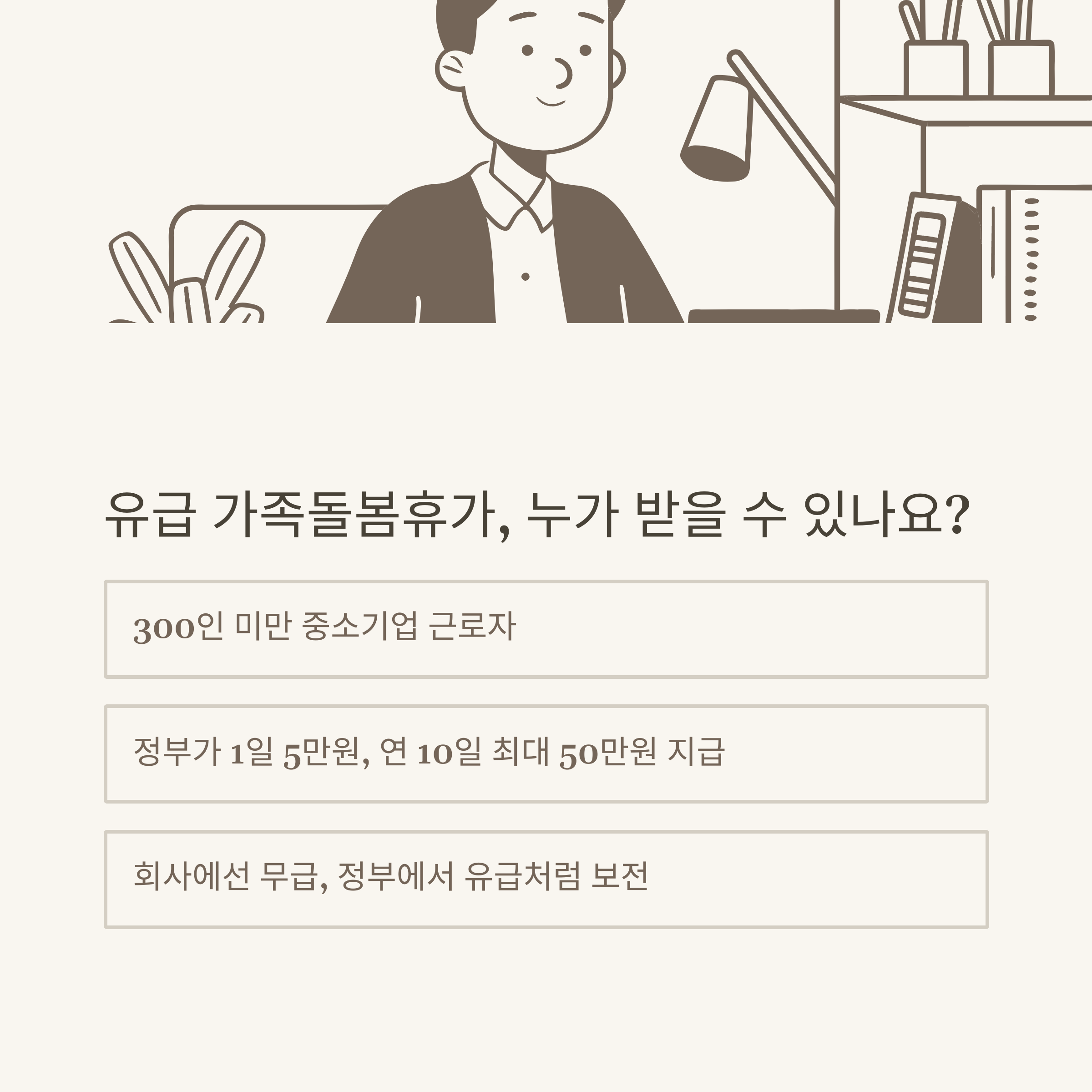 현재 유급 지원 대상은 중소기업(300인 미만)에 재직 중인 근로자로, 가족돌봄휴가를 사용할 경우 1일 5만 원씩 최대 10일까지 정부에서 직접 지급해주는 구조입니다. 저도 직접 신청해봤는데, 휴가기간 동안 회사에서는 무급이었지만, 정부에서 50만 원을 지급받아 실제로 유급처럼 활용할 수 있었어요.