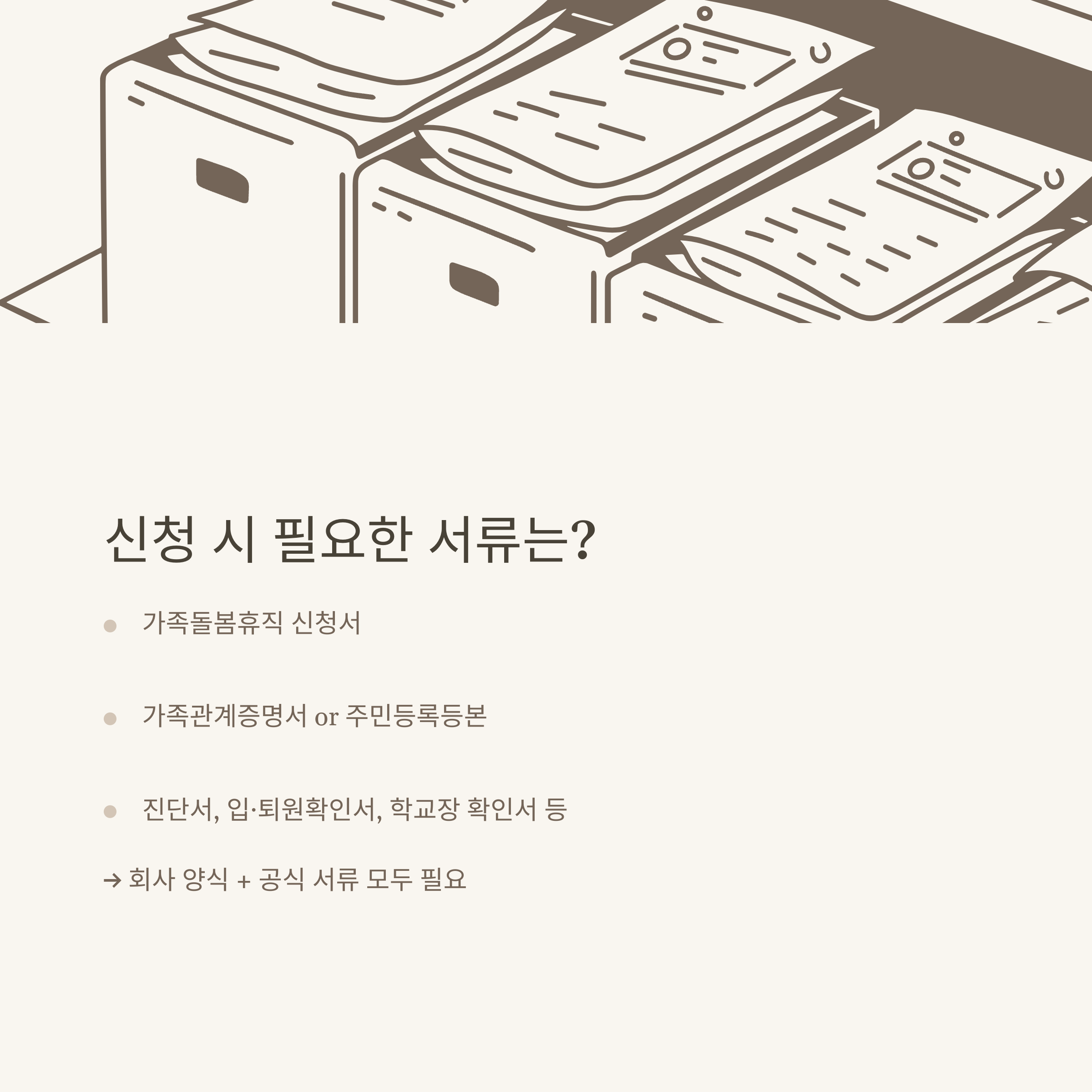 제가 직접 가족돌봄 휴직을 신청하면서 가장 신경 썼던 부분이 바로 ‘서류 준비’였습니다. 회사나 기관마다 요구 서류가 조금씩 다르긴 하지만, 기본적으로 가족돌봄 휴직 신청서, 가족관계증명서, 진단서(또는 입·퇴원확인서) 등이 필요합니다.