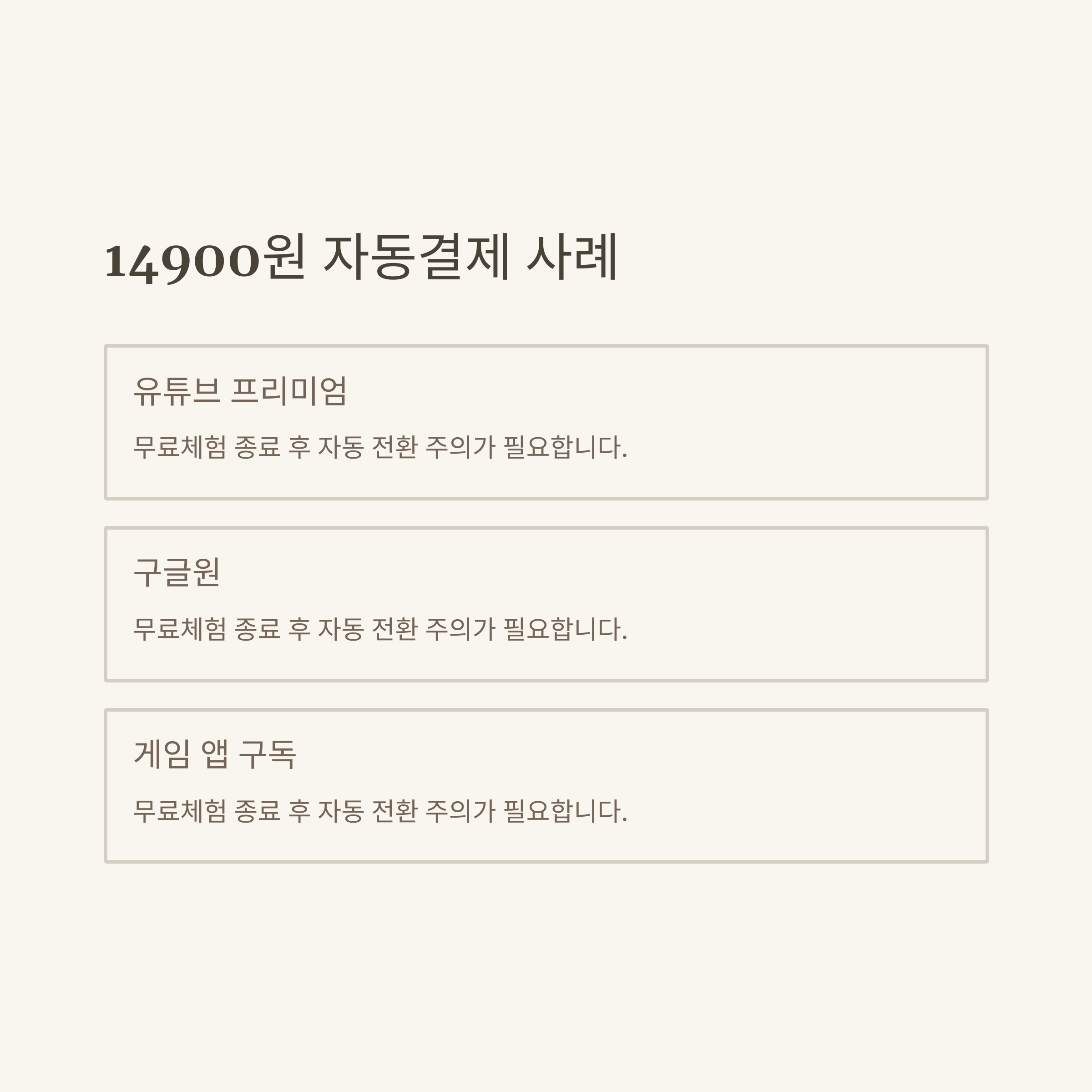 | 14900원 자동결제 | 유튜브 프리미엄, 구글원, 앱 구독 등 | 무료체험 후 자동전환 주의 |