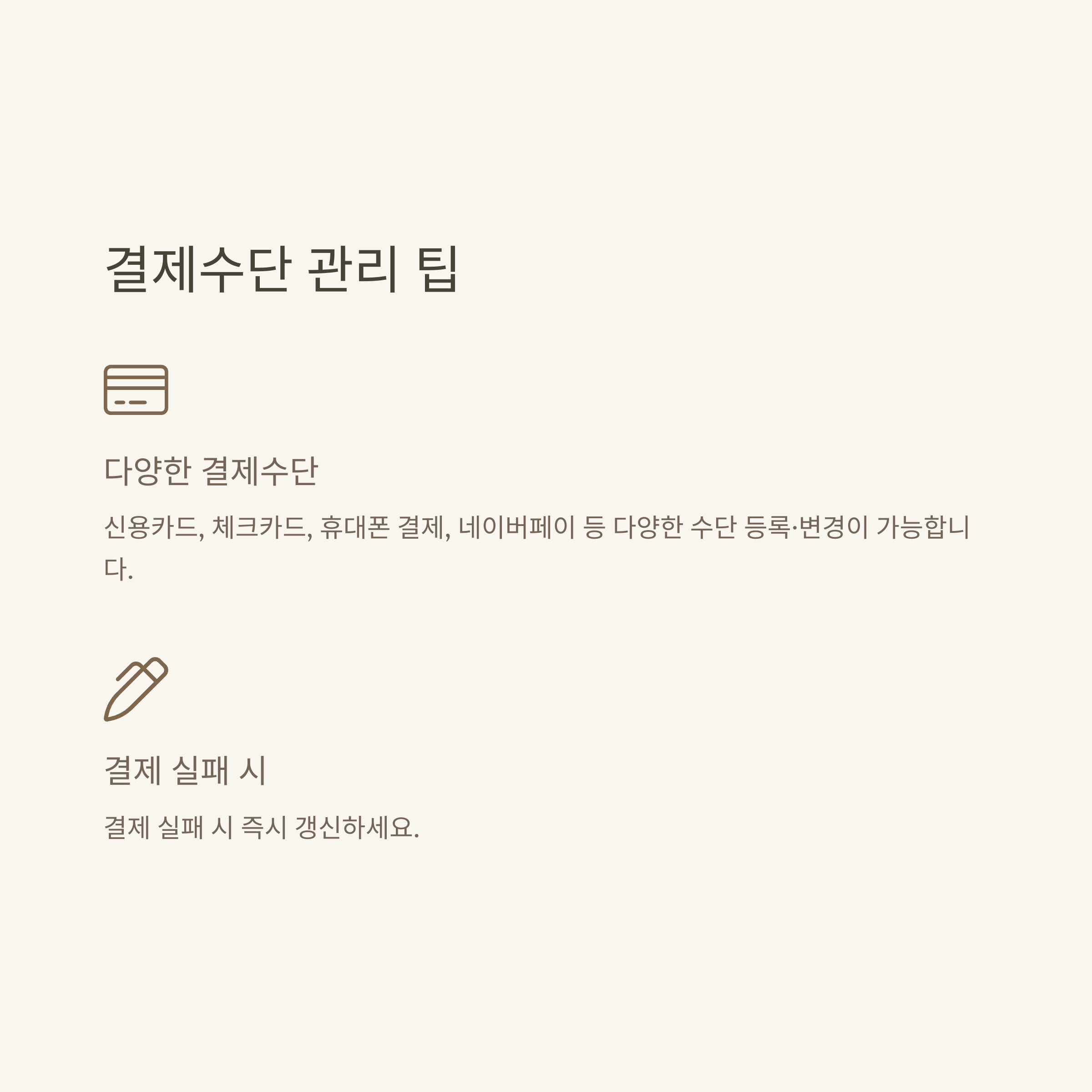 구글 결제센터에서 [결제수단] 메뉴로 들어가서 새 카드 추가, 기존 카드 삭제, 결제수단 우선순위 변경 등이 가능하며, 실시간으로 바로 반영됩니다. 결제수단이 만료됐거나 한도가 초과되면 자동결제가 실패하고, 구글플레이에서 결제실패 알림이 뜨니 즉시 결제수단을 갱신해야 구독이 끊기지 않습니다.