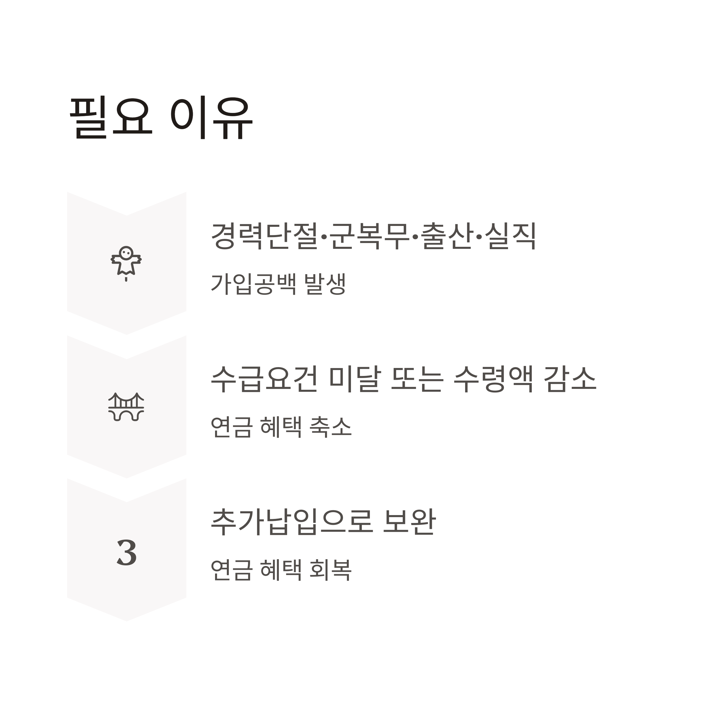 - 군복무자: 병역기간 동안의 납부 누락분 보완 가능