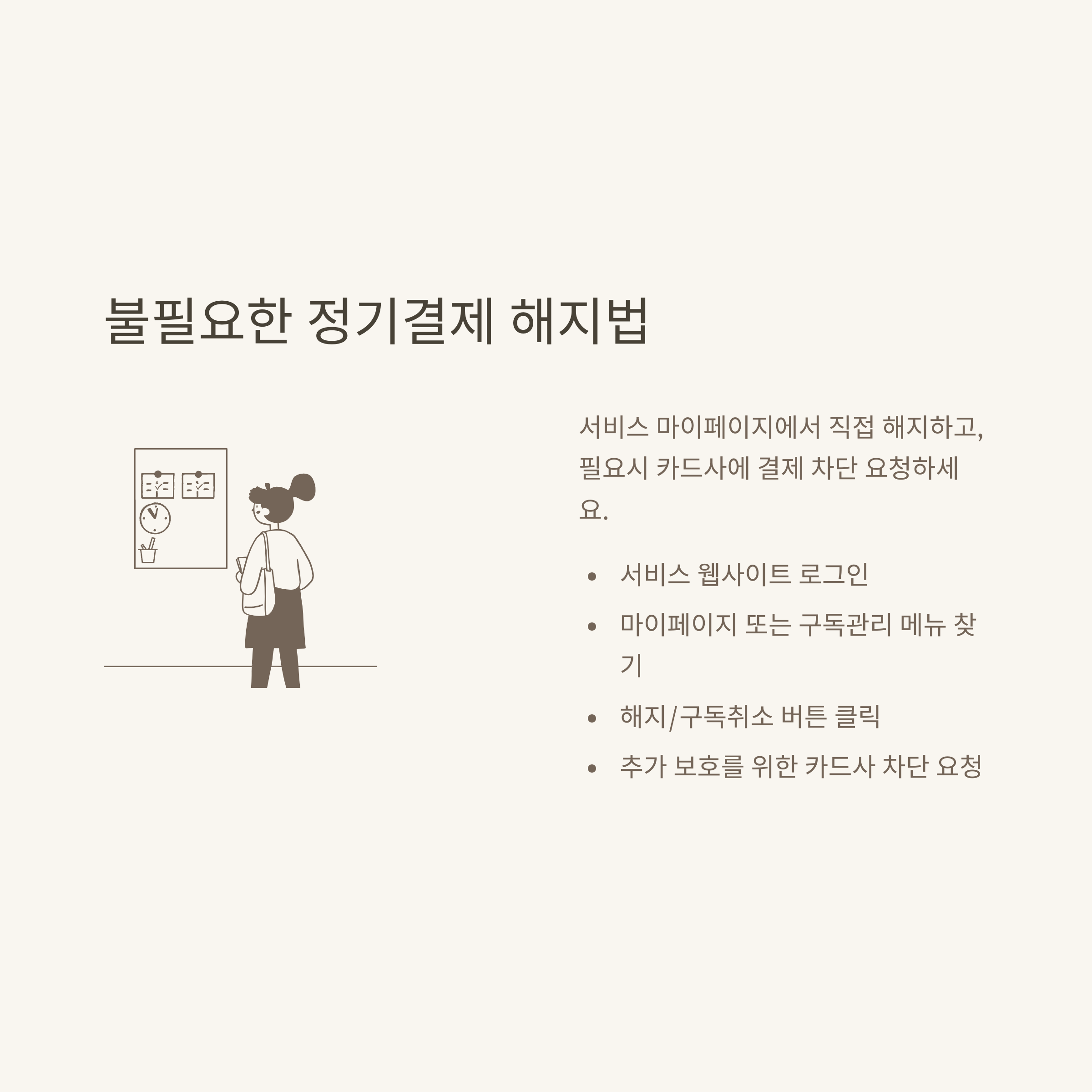 일반적으로 ‘마이페이지 > 결제내역 > 정기결제 관리’ 메뉴에서 해지가 가능하고, 해지 후에도 바로 결제가 멈추지 않는 경우에는 추가로 카드사에 결제 차단 요청을 하실 수 있습니다. 저는 번거로워도 반드시 서비스·앱 자체에서 해지 절차를 진행하는 편입니다.