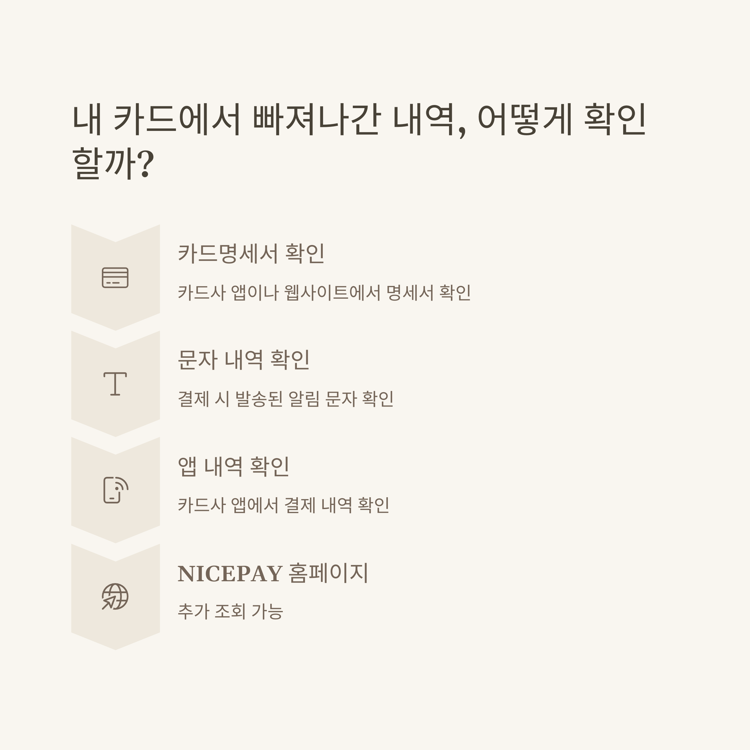확인이 안 되는 경우에는 카드사 고객센터, 결제내역상 상점명, NICEPAY 고객센터 순으로 문의하면 ‘어떤 서비스에서 결제된 건지’ 빠르게 안내받을 수 있습니다. 특히 자동결제·정기결제는 서비스별 마이페이지 내 ‘결제내역’이 가장 정확합니다.