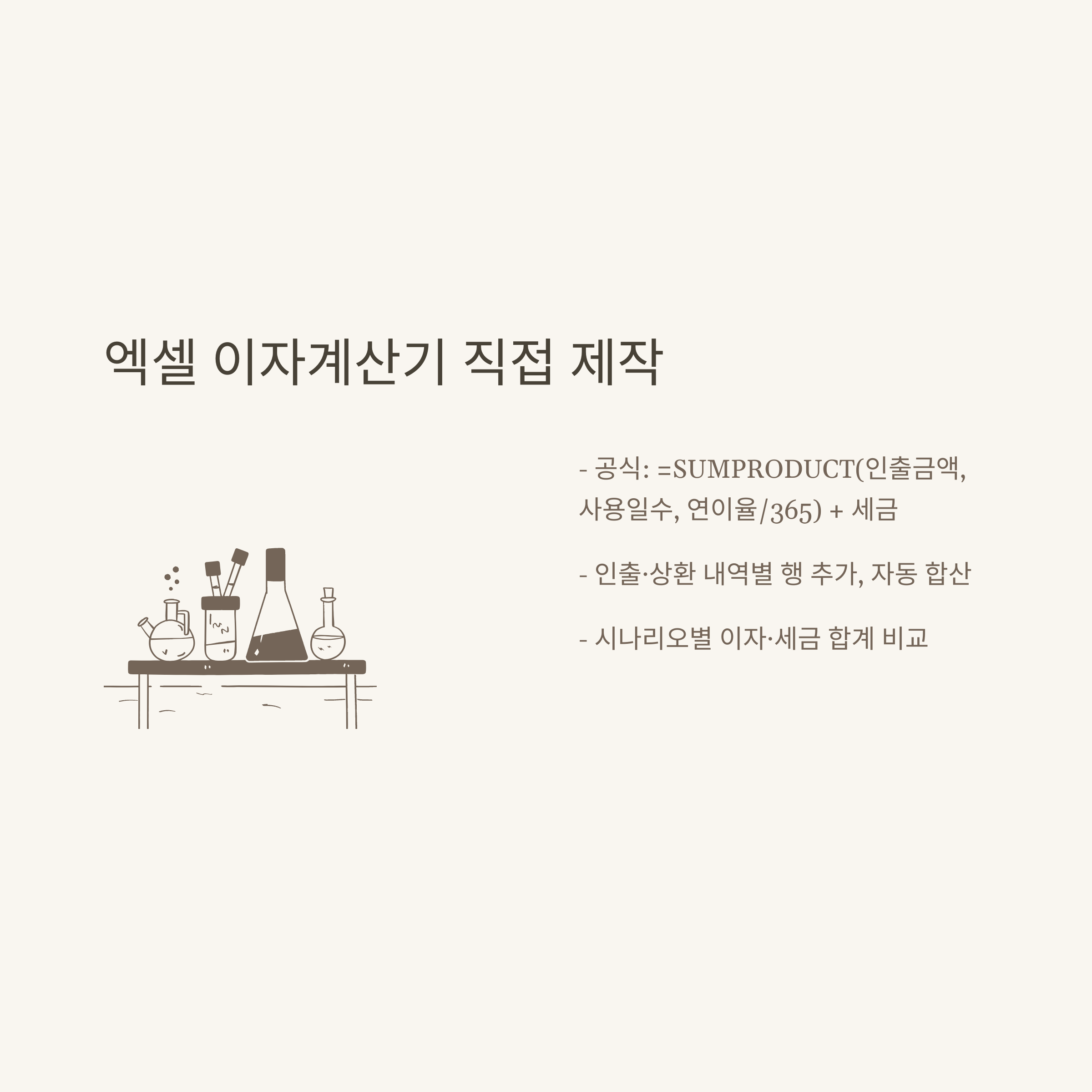 저는 은행 공식 계산기도 자주 쓰지만, 내 상황에 맞는 다양한 시나리오를 계산할 땐 엑셀을 꼭 활용합니다. 직접 사용금액, 사용일수, 금리, 세금, 부대비용 등을 입력해서 실질 부담 이자를 미리 계산할 수 있거든요.