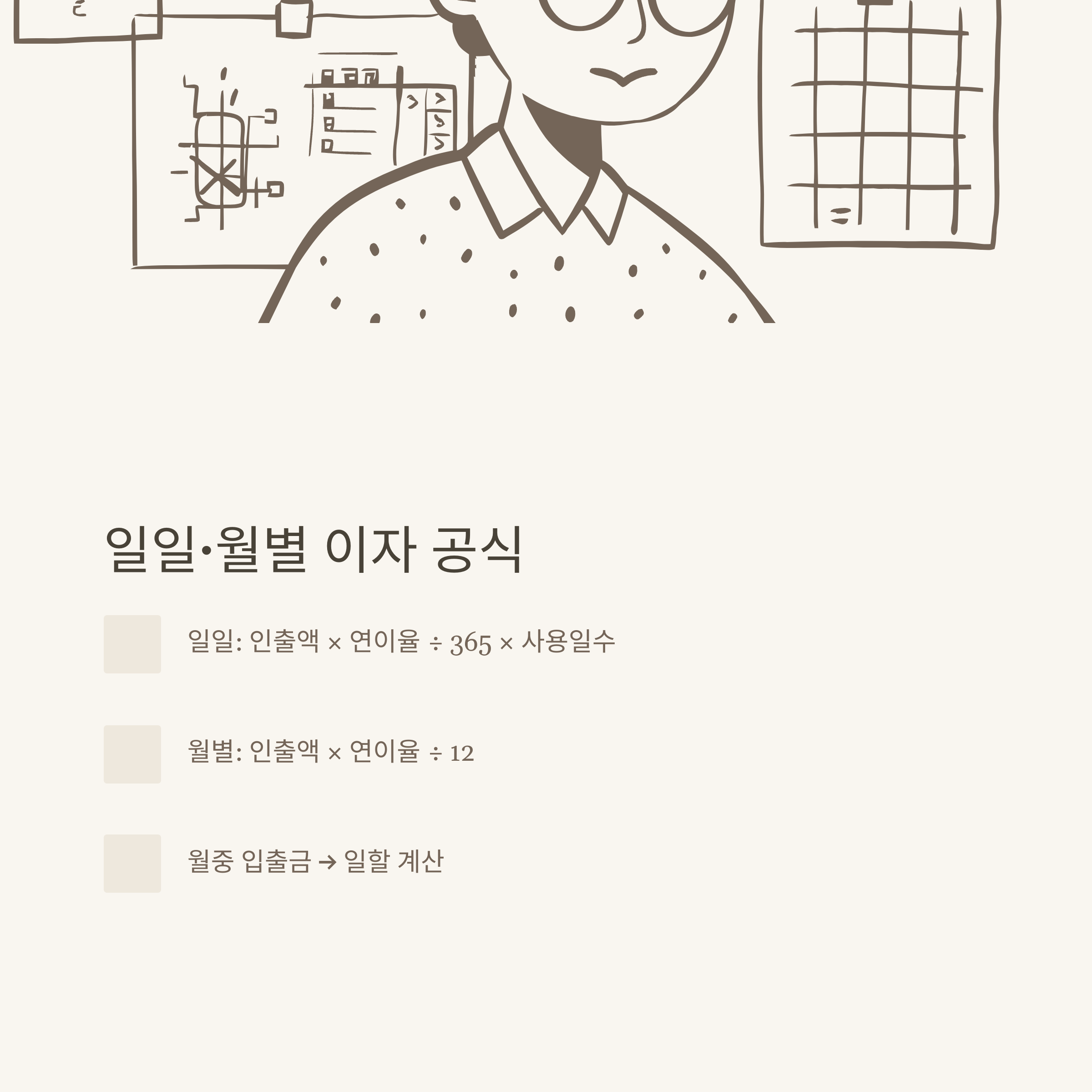 - 출금(인출) 즉시 이자 발생, 입금(상환) 시점부터 이자 중단
