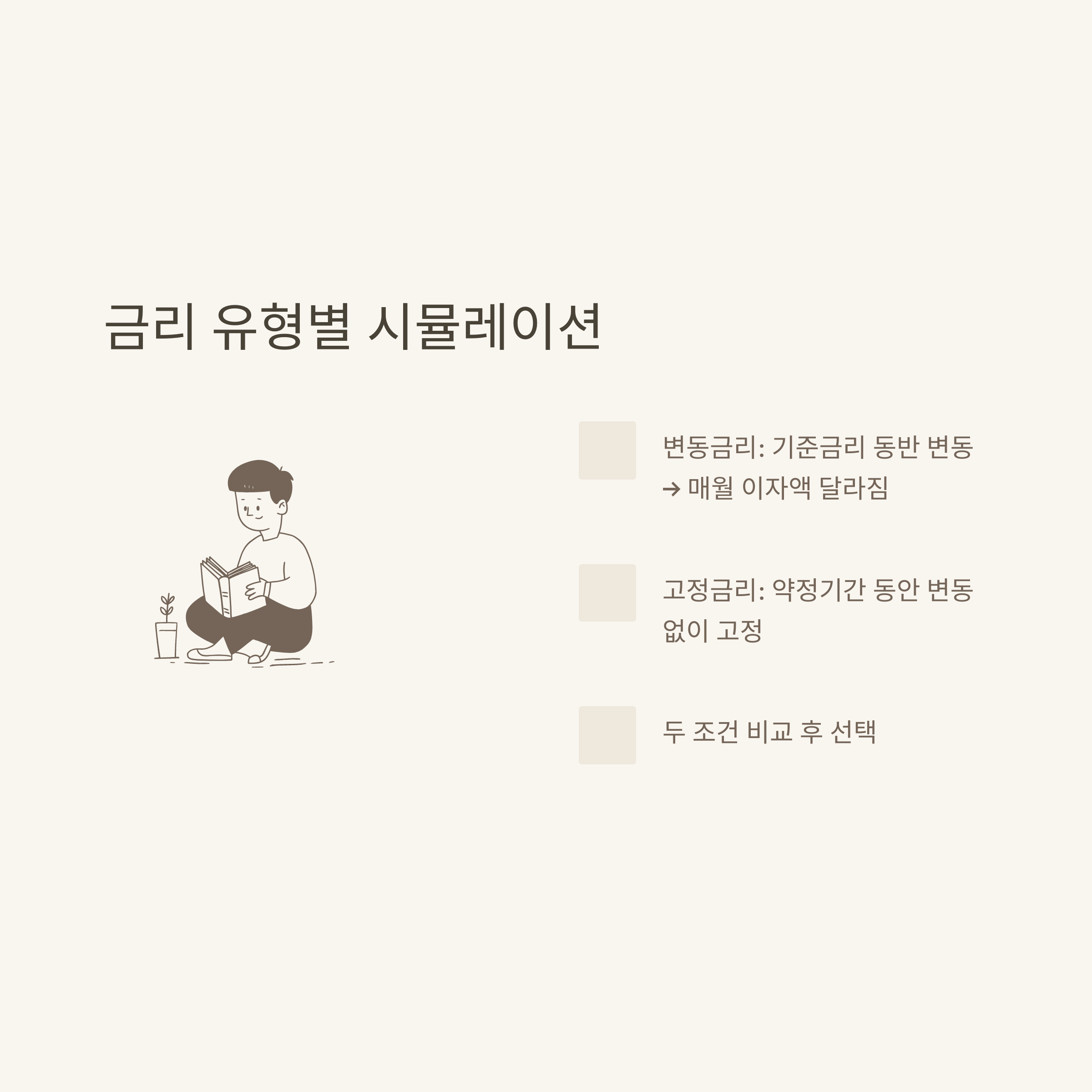 - 변동금리: 기준금리 변동시 자동 반영, 매월 이자 차이 발생