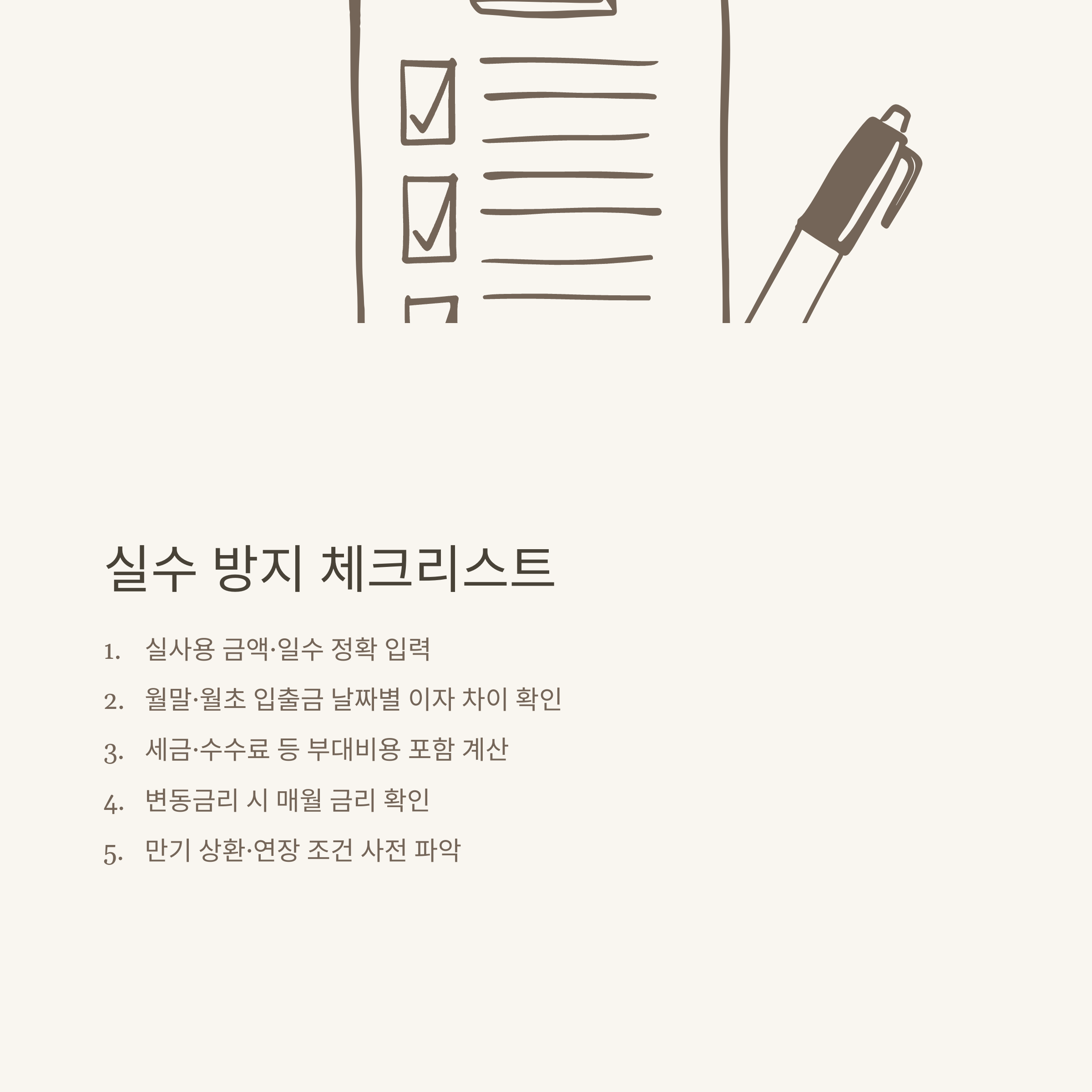 저도 마이너스통장 이자를 처음 접할 때 ‘이 정도면 괜찮겠지’ 하며 대략적으로만 계산했다가, 실제로 더 많은 비용이 청구되어서 당황한 적이 많아요. 아래 체크리스트만 챙겨도 예기치 않은 이자 폭탄은 충분히 막을 수 있습니다.