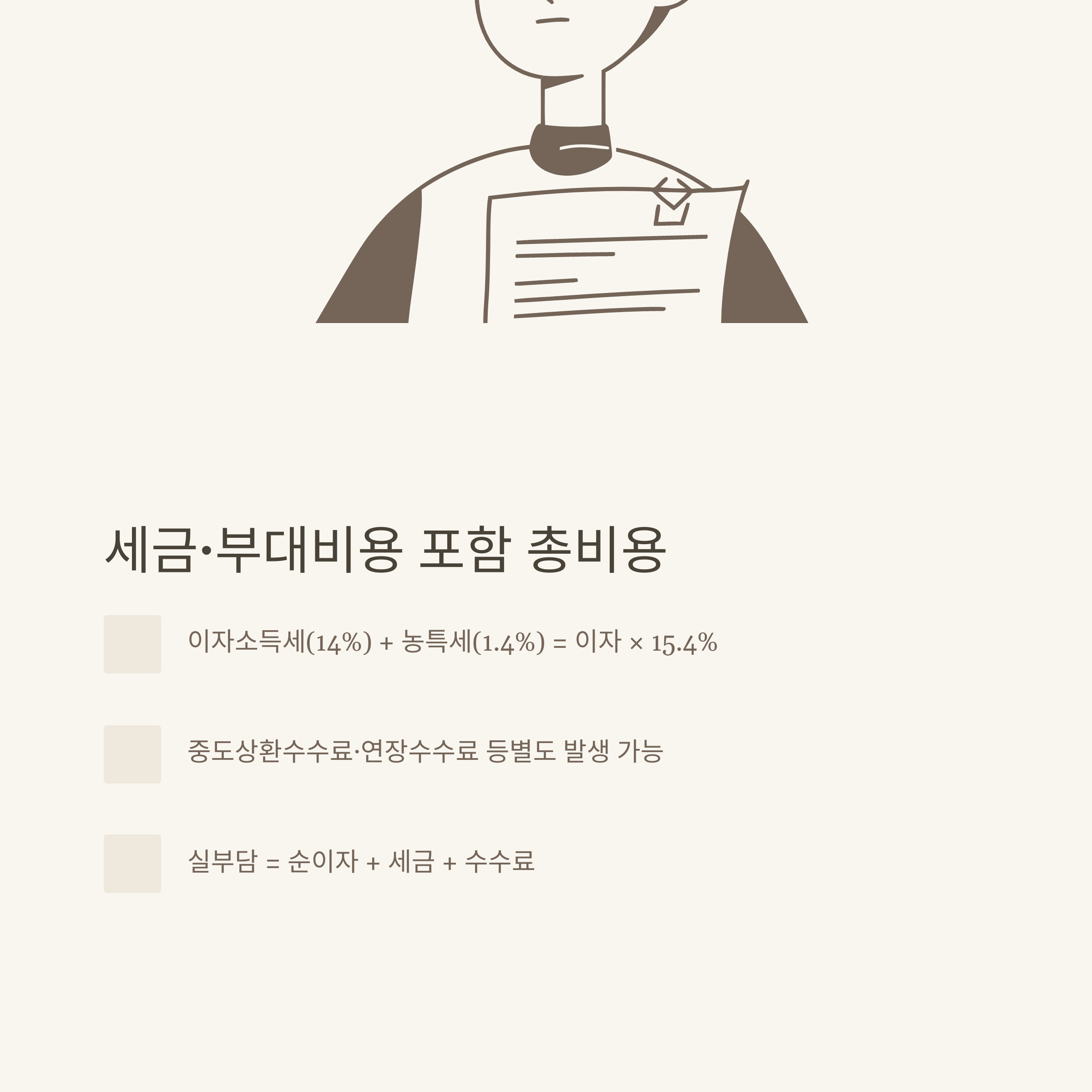 - 이자소득세(14%) + 농어촌특별세(1.4%) = 총 15.4% 추가