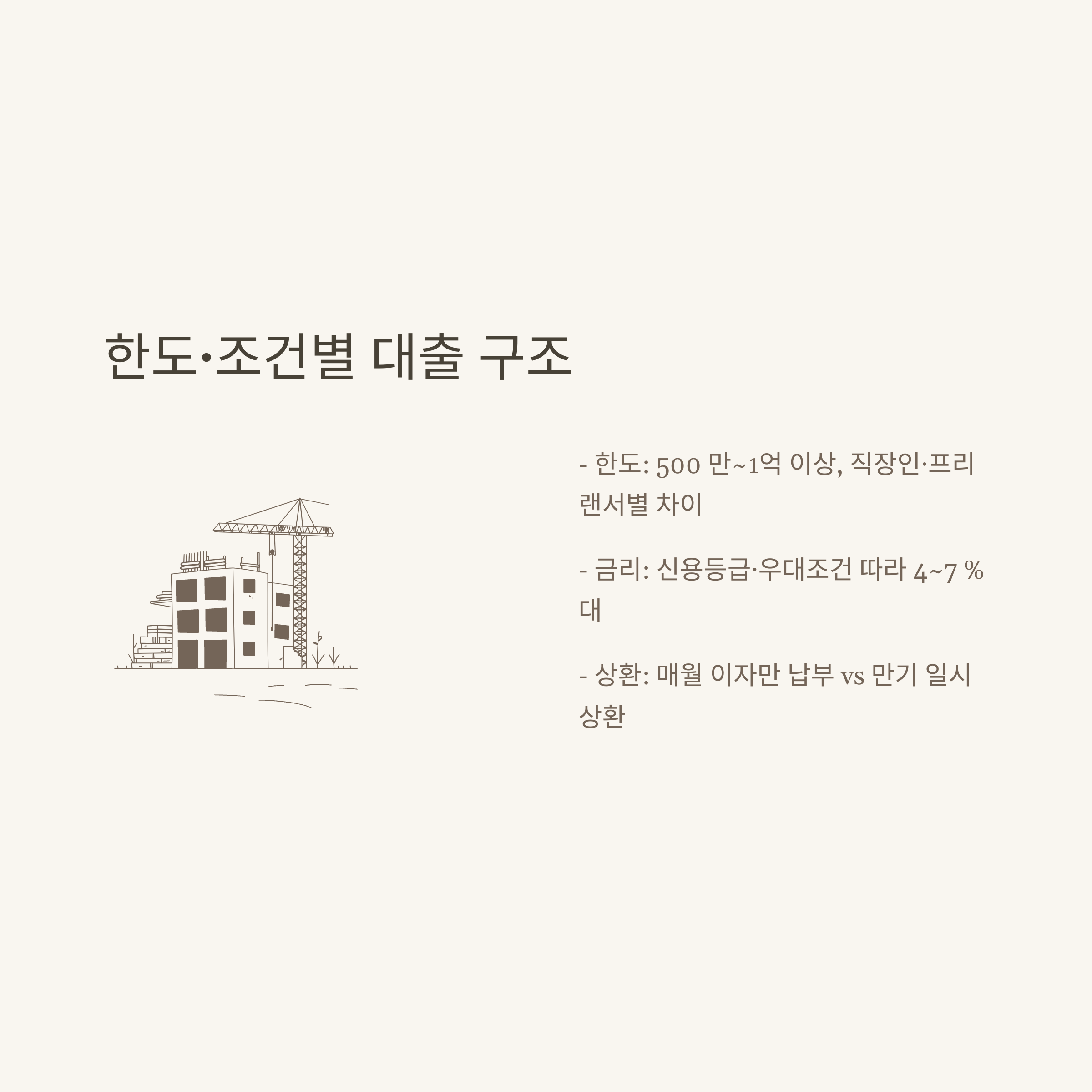 - 한도: 500만~1억 이상까지, 직장인/프리랜서 조건별 차이