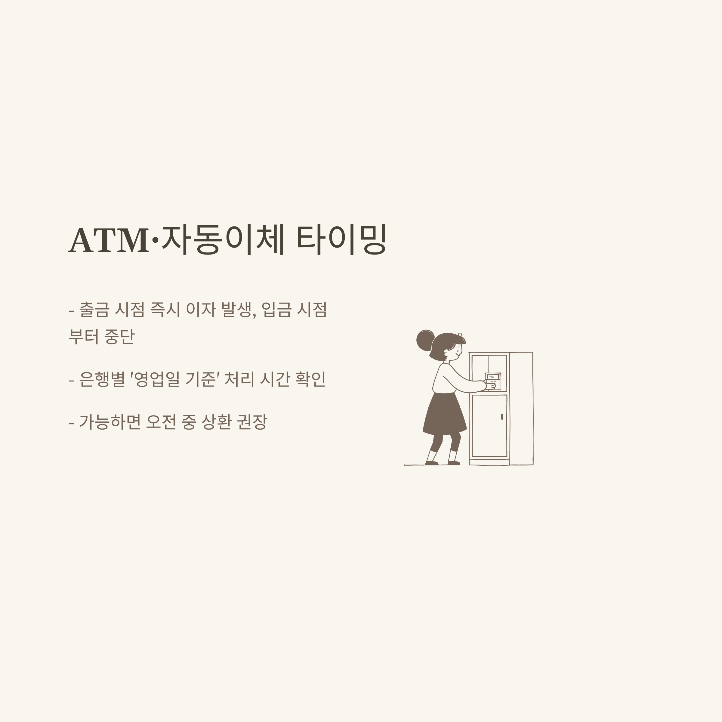 | ATM/자동이체 | 입출금 시간 따라 이자 다름, 가능하면 오전 상환 |