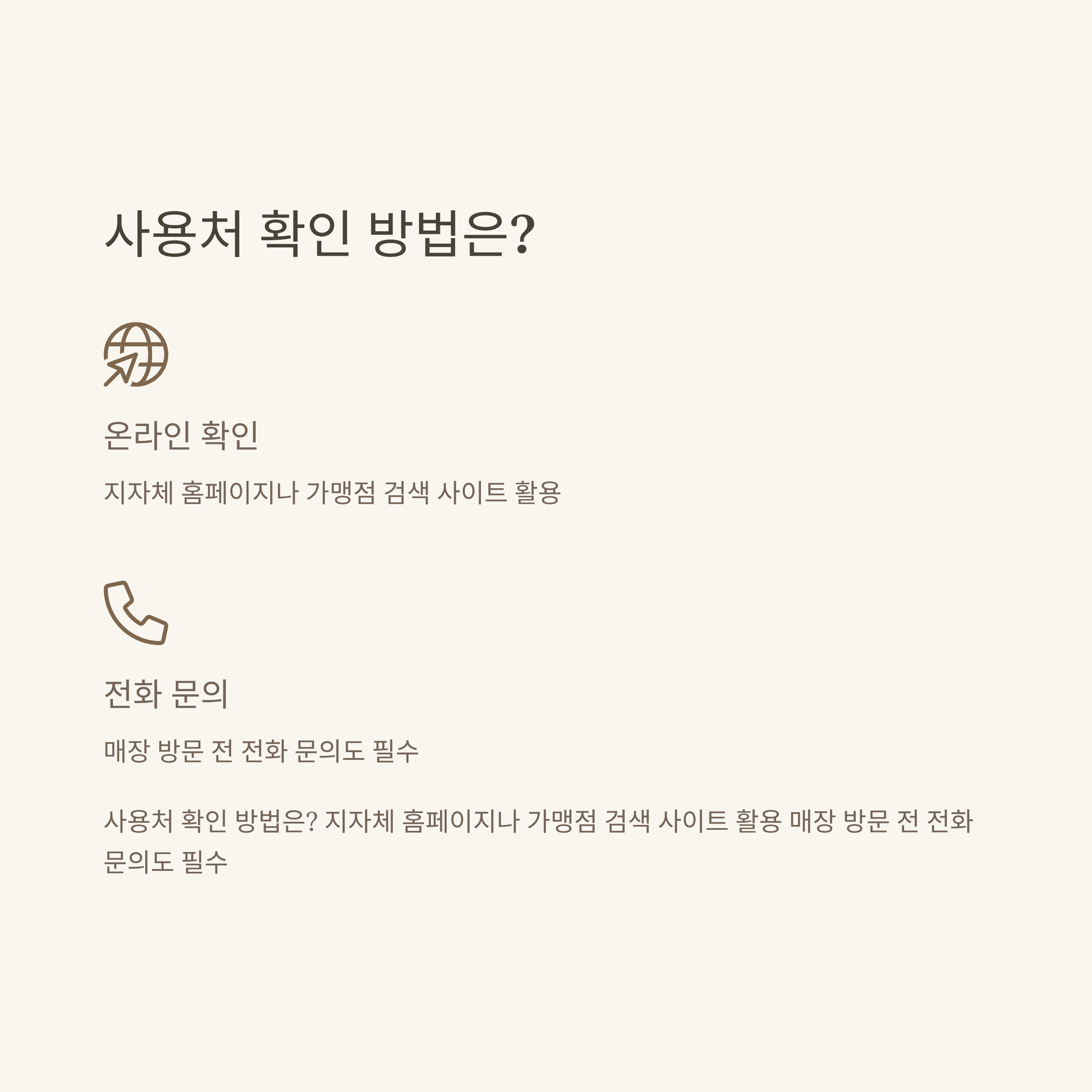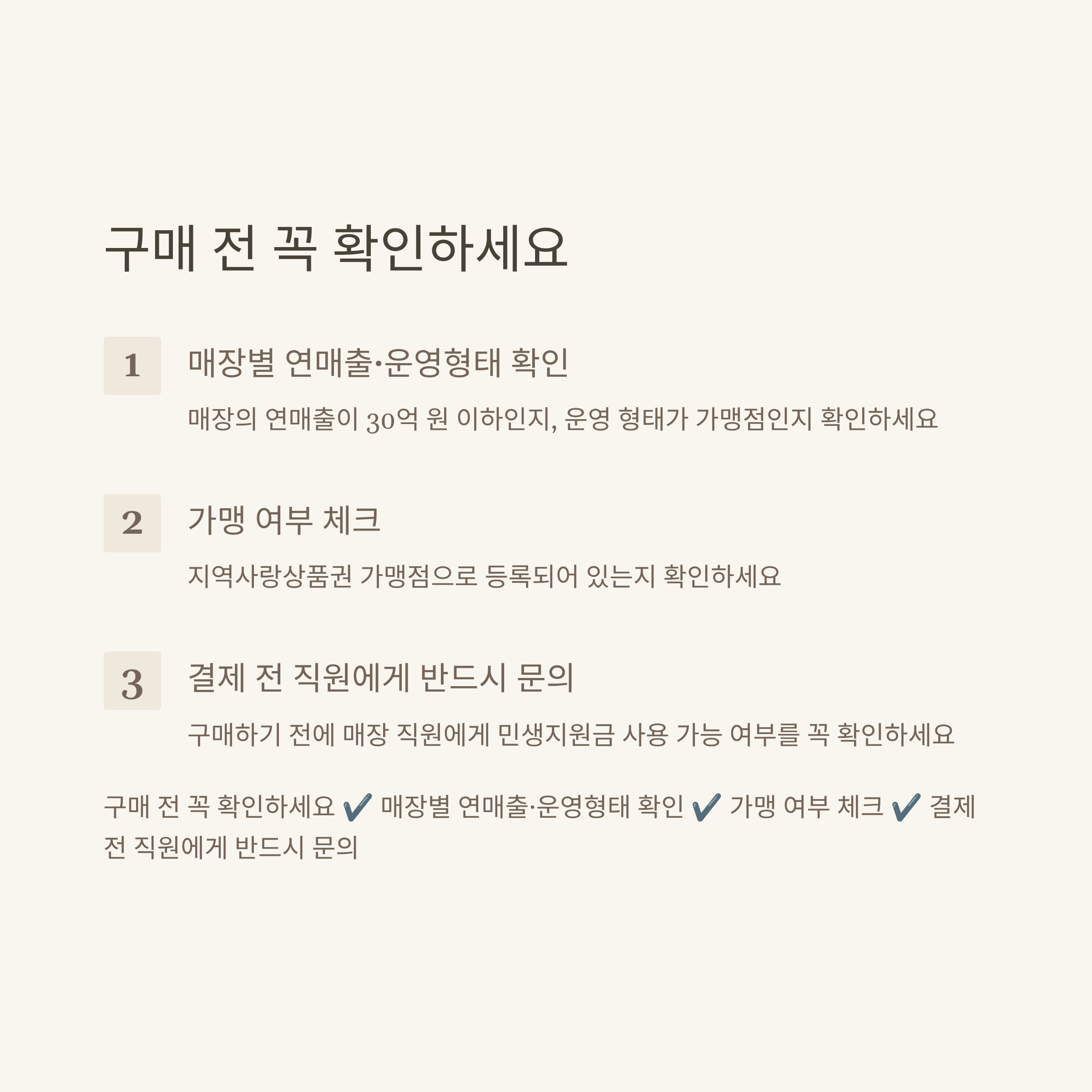 또한, 매장에 직접 전화하거나 방문해 ‘민생회복 소비쿠폰’ 사용 가능 여부를 확인하는 것이 좋습니다. 방문 전 확인하지 않아 현장에서 사용 불가를 듣는 사례가 빈번하니 꼭 사전 확인을 권장합니다.