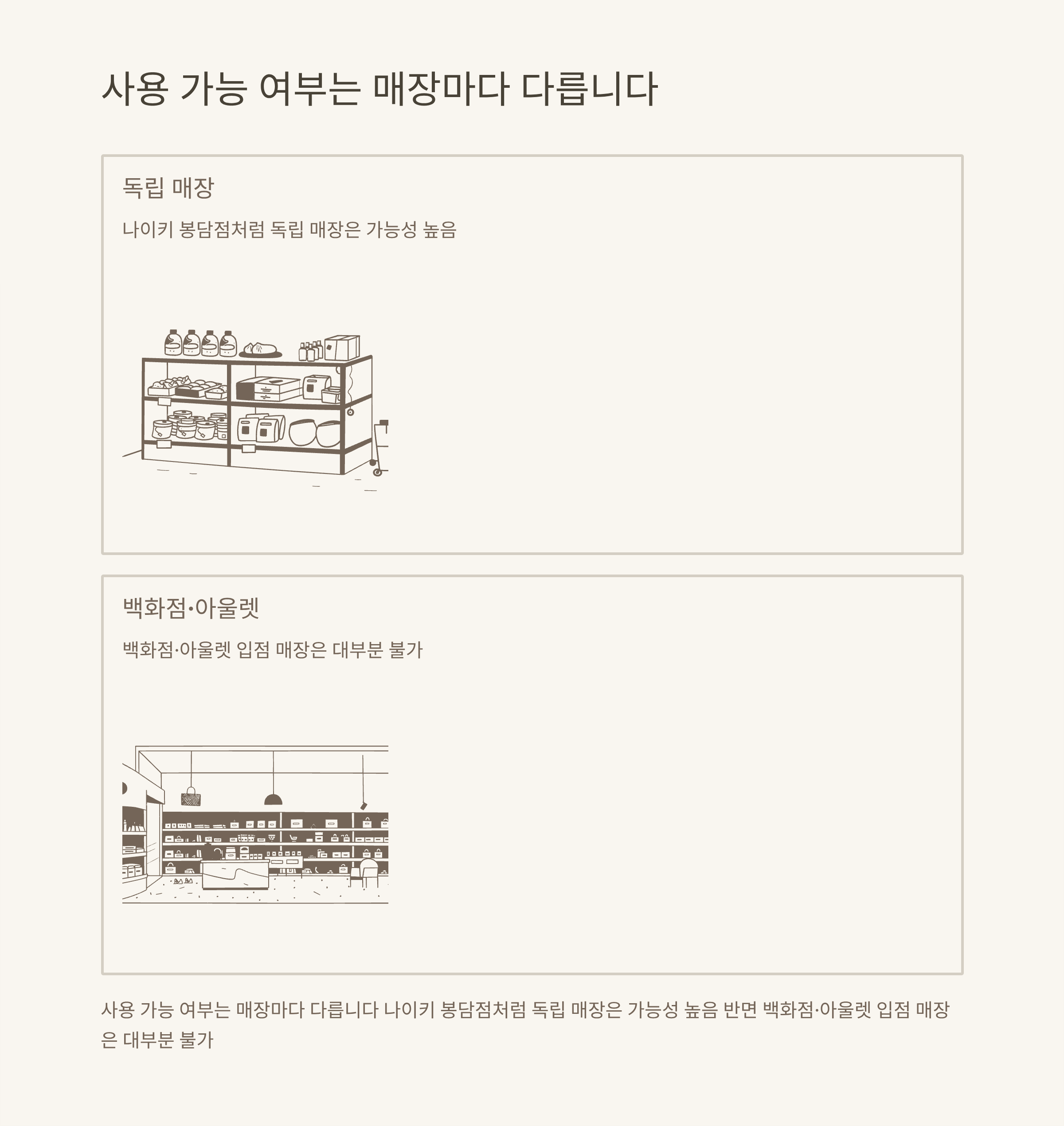 제가 직접 나이키 봉담점(가맹점)에서 사용 가능한 것을 확인했고, 반면 대형 백화점 내 직영점은 사용 불가였습니다. 소비자 입장에서는 매장 방문 전 반드시 문의하고, 카드 결제 전에 확인하는 절차가 필수입니다.