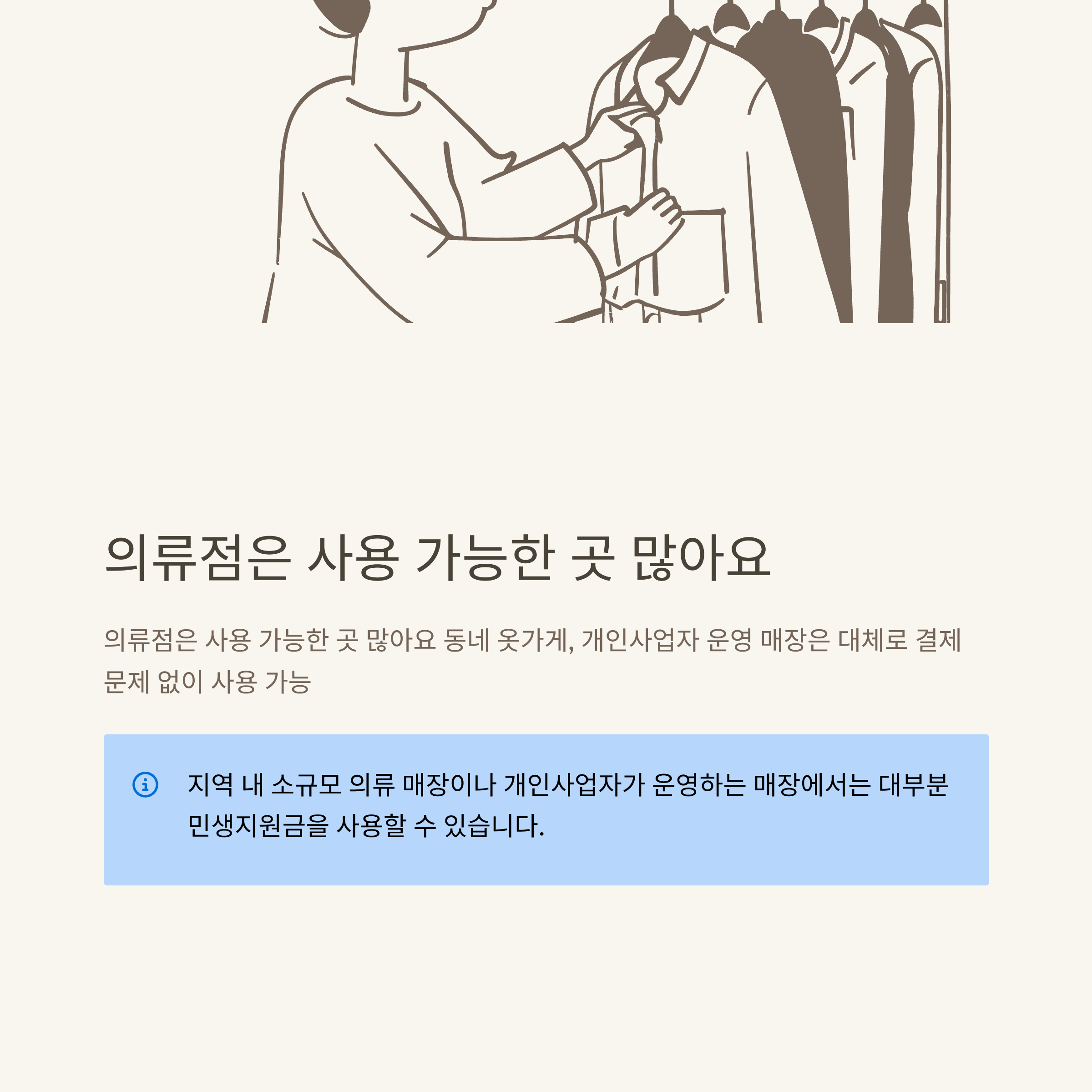 소상공인 업종의 의류점은 민생지원금 사용처로 적합하니 평소 자주 이용하는 동네 매장부터 확인해 보시길 추천드립니다.