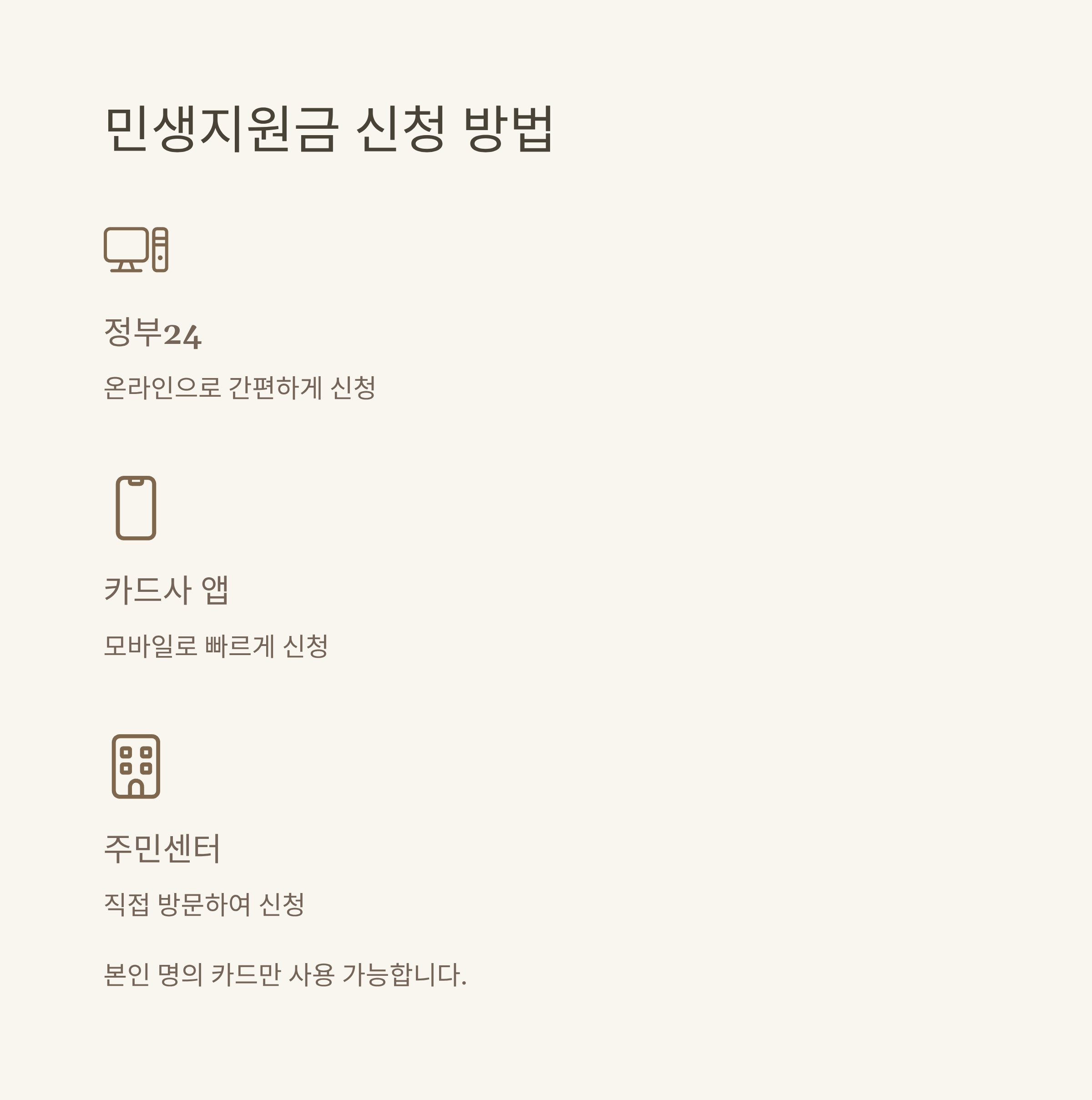 민생지원금을 체크카드로 사용하려면 먼저 정확한 신청 절차를 알아야 합니다. 저는 처음에 정부24만 생각했는데, 카드사 앱에서도 신청이 가능하더라고요. 절차만 알면 생각보다 간단하게 진행됩니다.