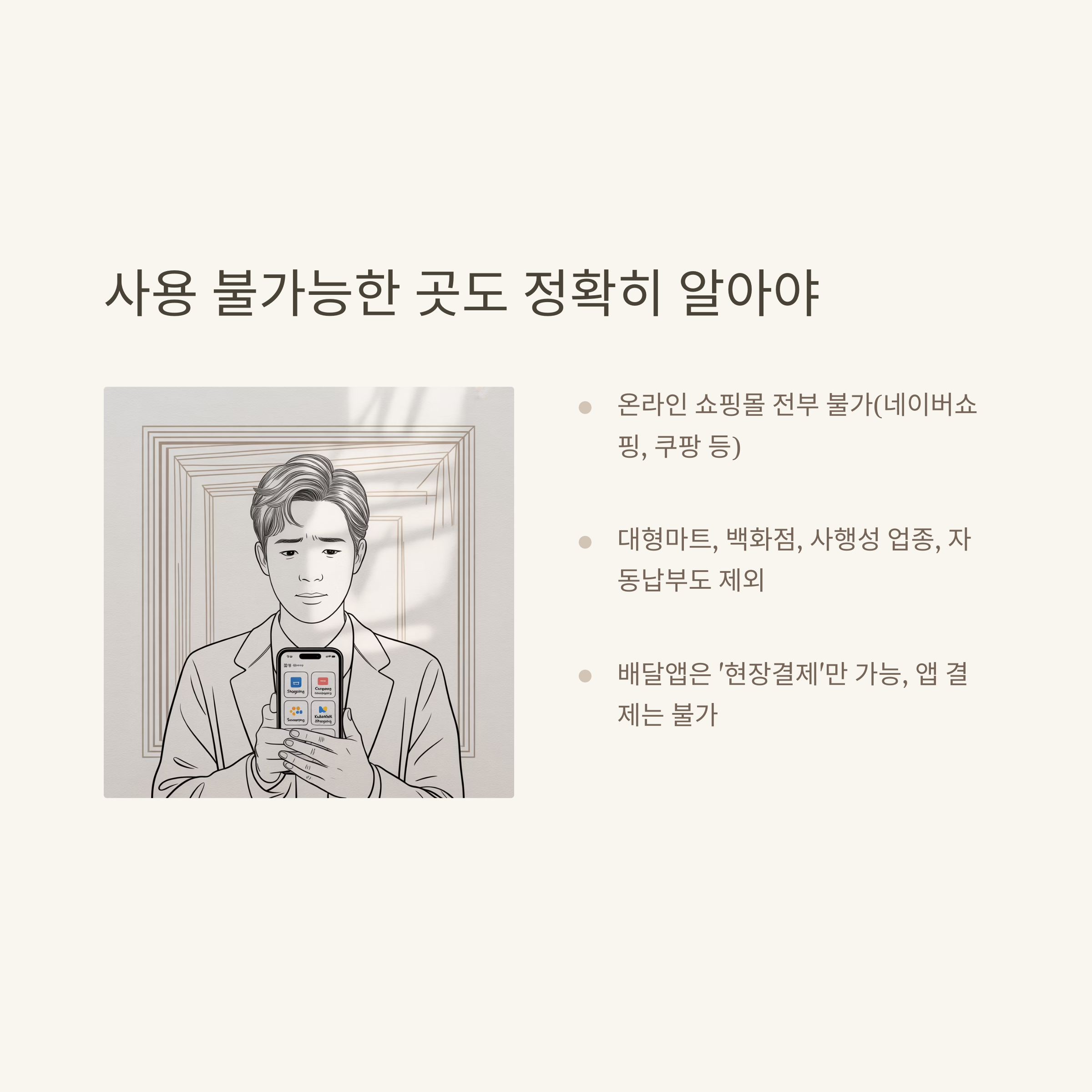 불가 업종 | 대형마트(이마트, 홈플러스 등), 백화점, 아울렛, 면세점, 온라인 쇼핑몰(네이버쇼핑, 쿠팡, G마켓 등), 유흥·사행성 업소, 보험·공공요금 자동납부, 통신요금 등 |