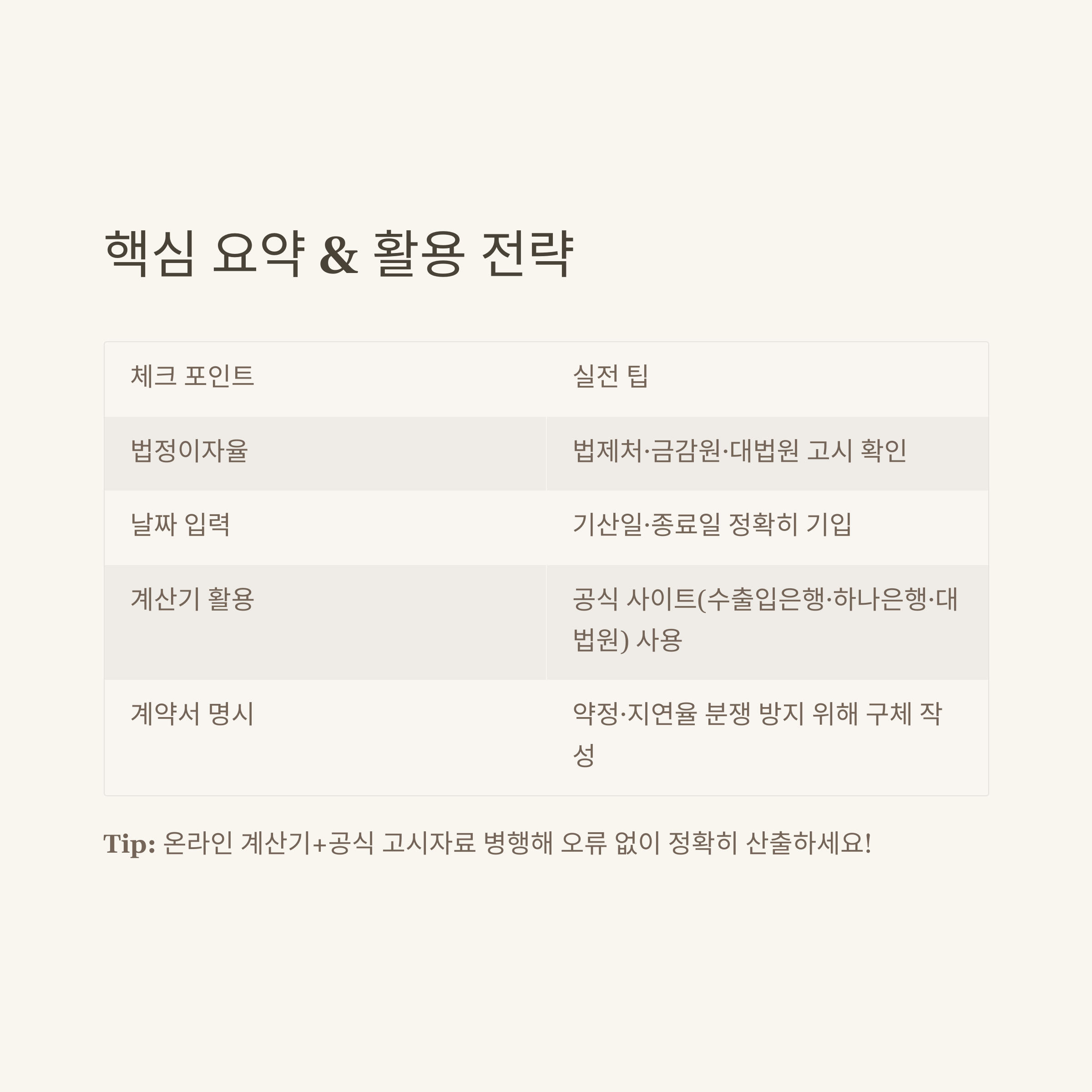 | 공식 계산기 활용 | 수출입은행, 하나은행, 대법원 등 이용 권장 |