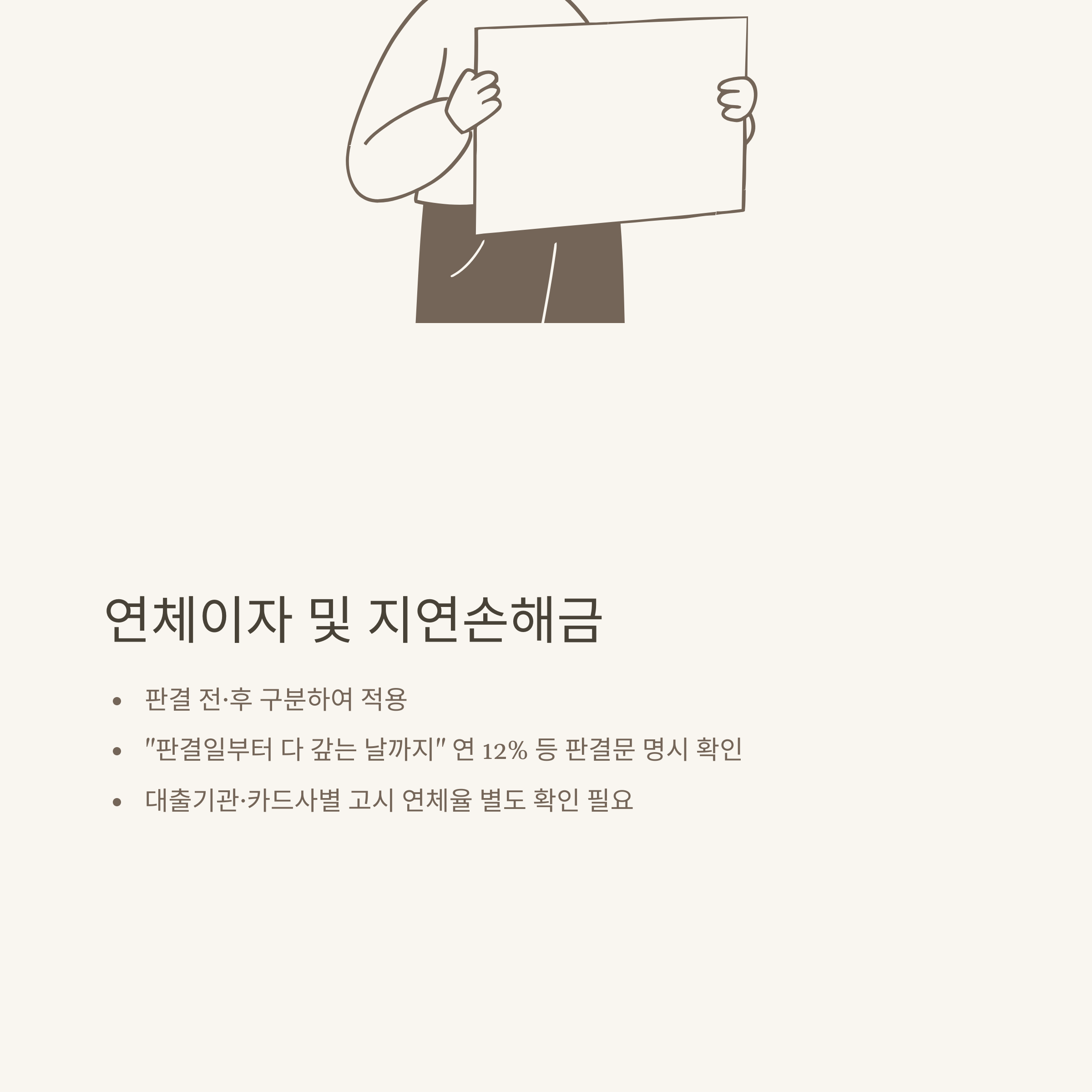 A. 소송 판결 이후 돈을 갚지 않을 때 추가로 붙는 이자로, 대법원 고시율 등을 적용합니다.