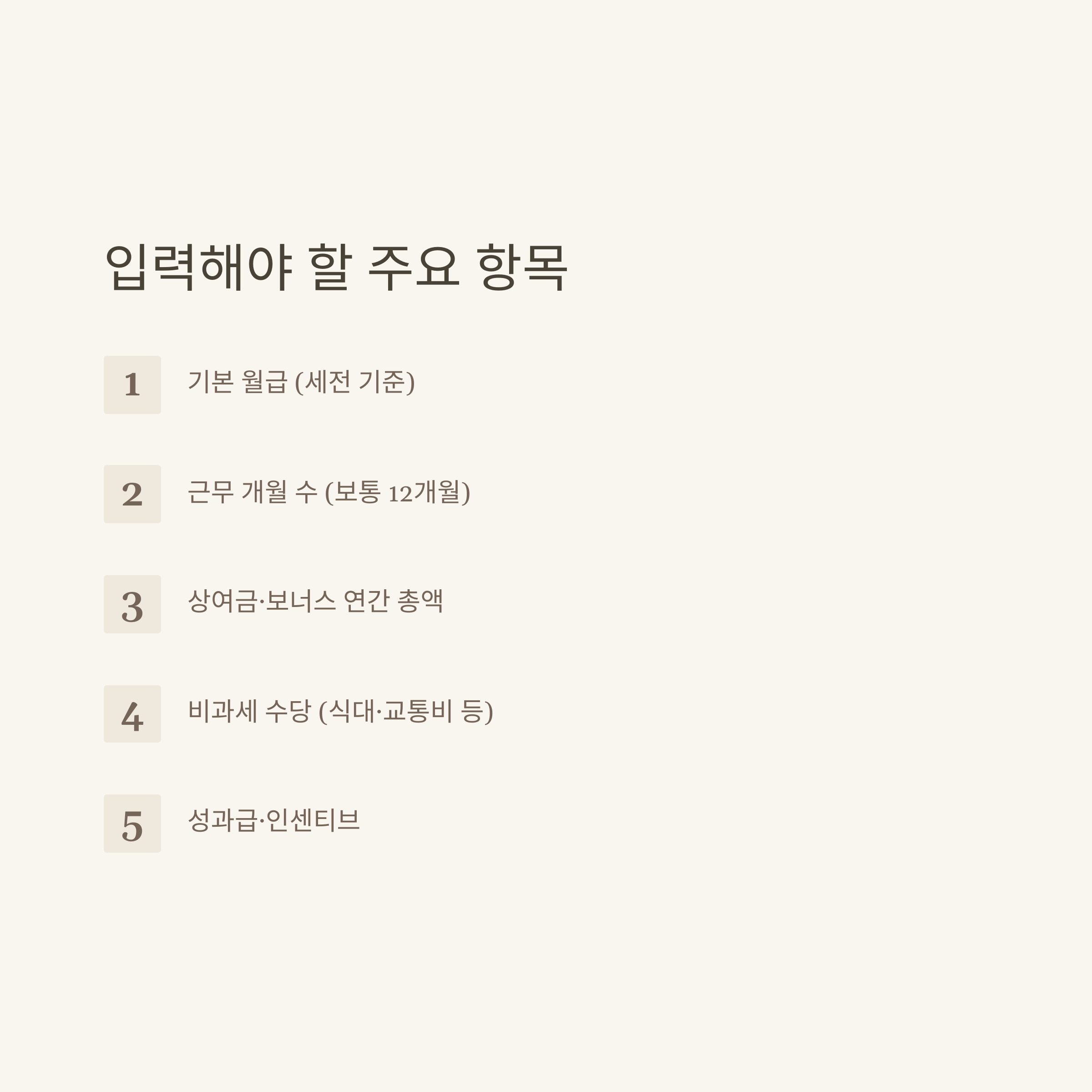 일반적으로 세전 연봉 계산기에 필요한 주요 입력 항목은 다음과 같습니다: