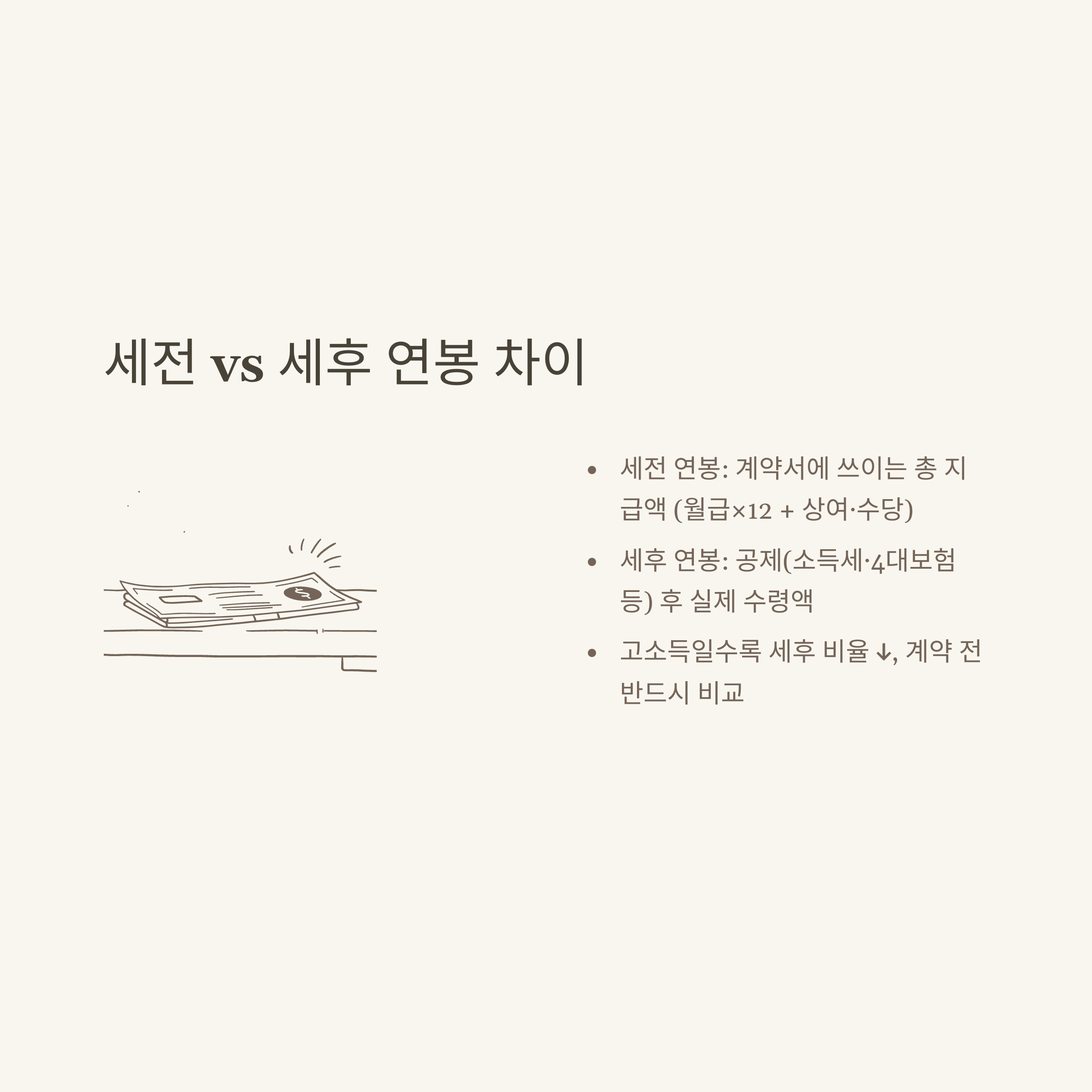 - 세후 연봉 = 세전 연봉 - (소득세 + 국민연금 + 건강보험 등)