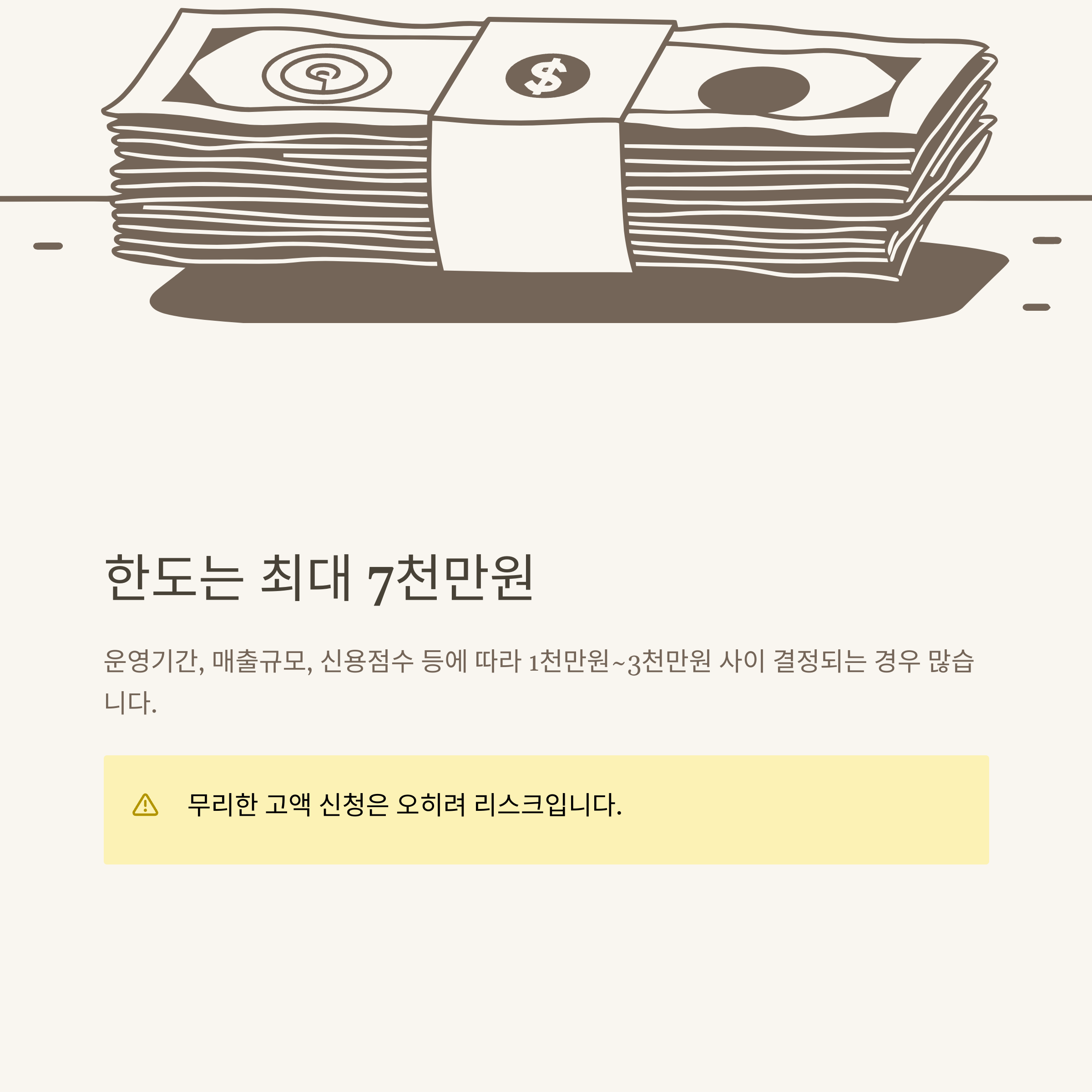 | 대출 한도 | 최대 7천만원 (평균 1천~3천만원) |