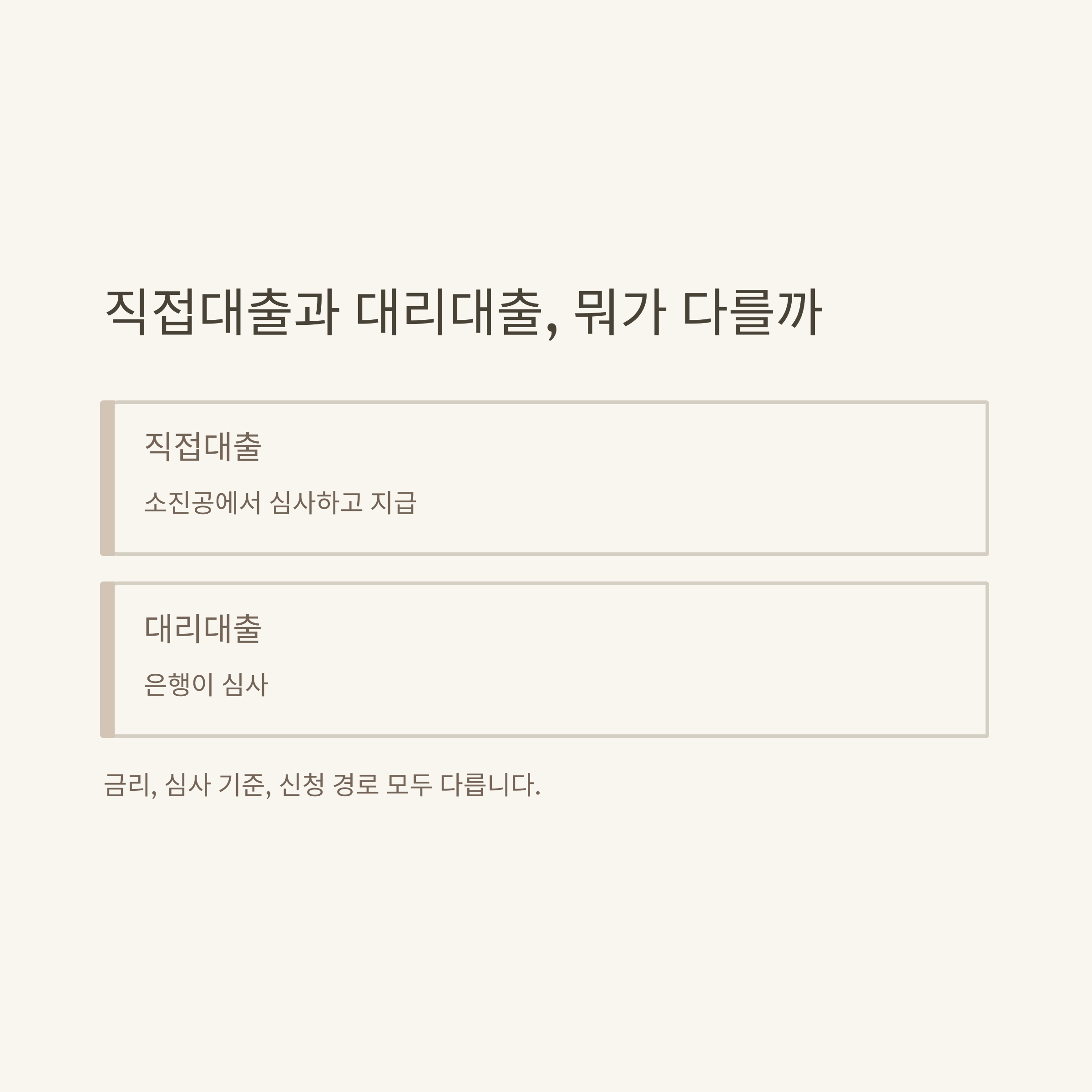 제가 정책자금을 처음 접했을 땐 ‘직접대출’과 ‘대리대출’의 차이가 무엇인지 몰라서 혼란스러웠어요. 실제로 두 방식은 신청 경로부터 심사 절차, 자금 지급 방식까지 완전히 다릅니다. 아래 표를 참고하시면 이해가 쉬우실 거예요.