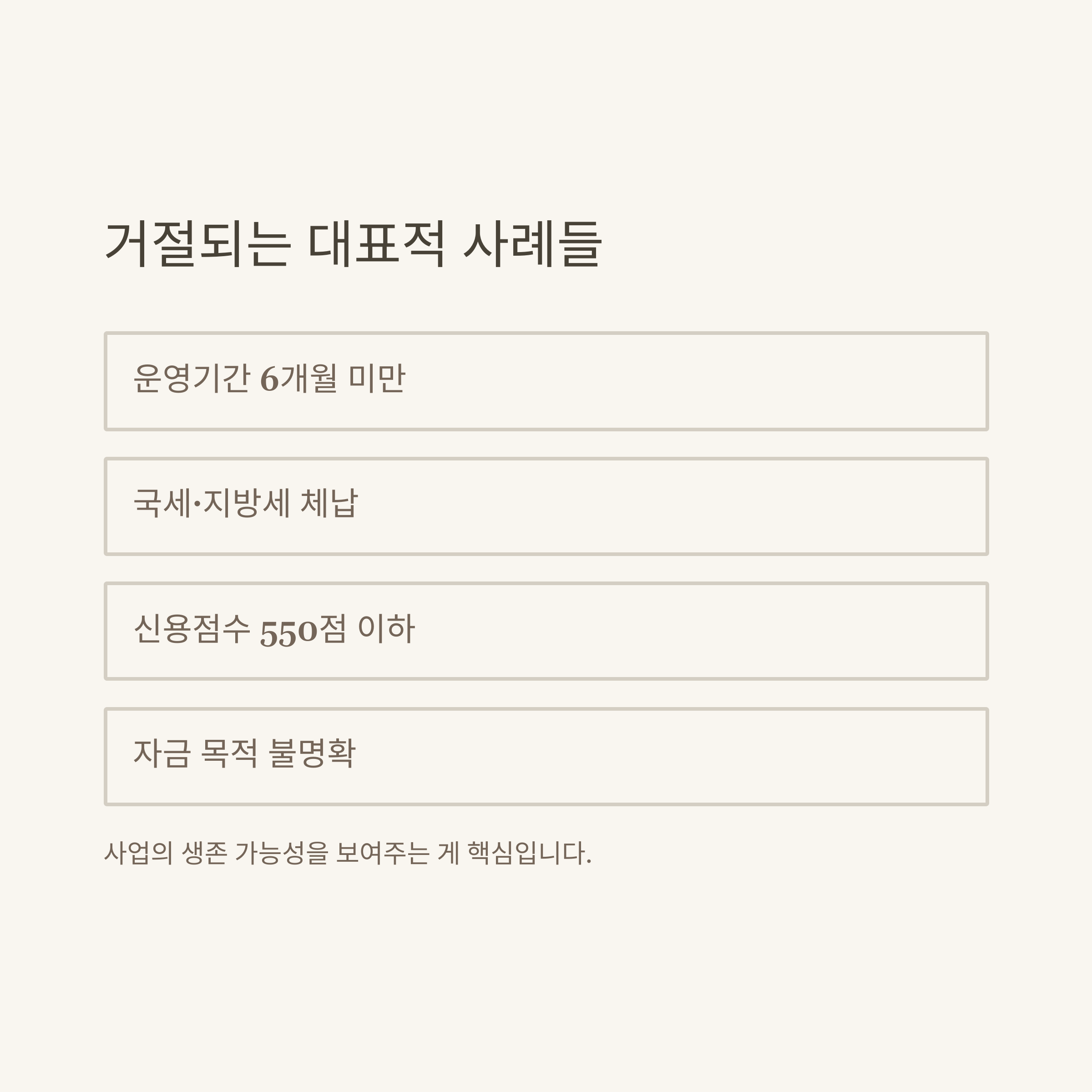 정책자금 직접대출은 누구나 신청 가능하지만, 모든 신청자가 승인받는 건 아닙니다. 저도 접수센터에 다녀왔을 때, 거절되신 분들 사례를 들으며 미리 조심할 부분을 메모해뒀어요. 아래는 실제로 자주 발생하는 거절 사유입니다.