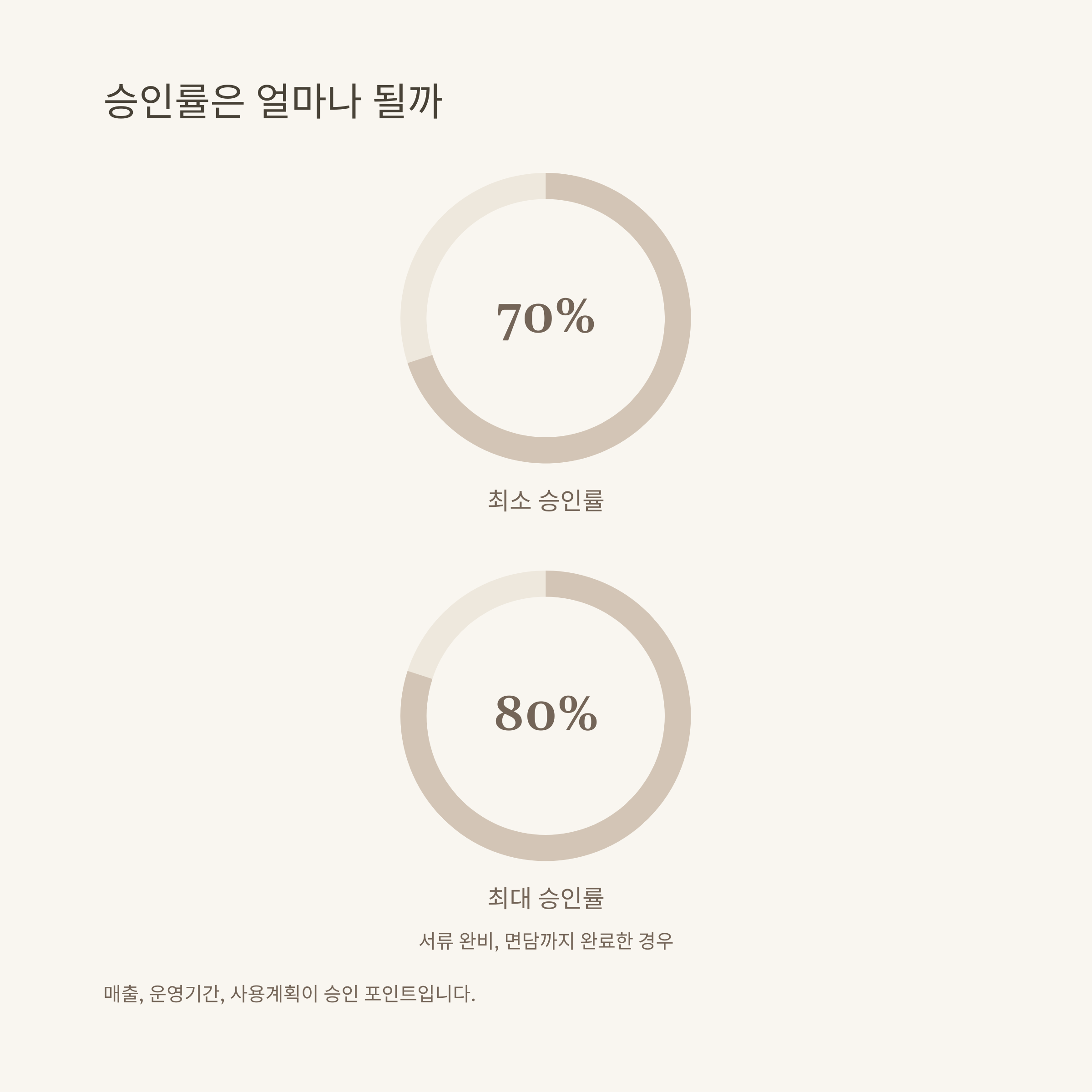 공식적으로 승인률이 매번 공개되지는 않지만, 소상공인시장진흥공단 상담사에게 직접 문의했을 때는, 서류 완비 후 면담까지 완료한 경우 약 70~80% 수준이라고 들었어요. 특히 매출이 일정 이상 있고, 운영기간이 1년 이상인 경우 긍정적 평가를 받기 쉽다고 하더라고요.