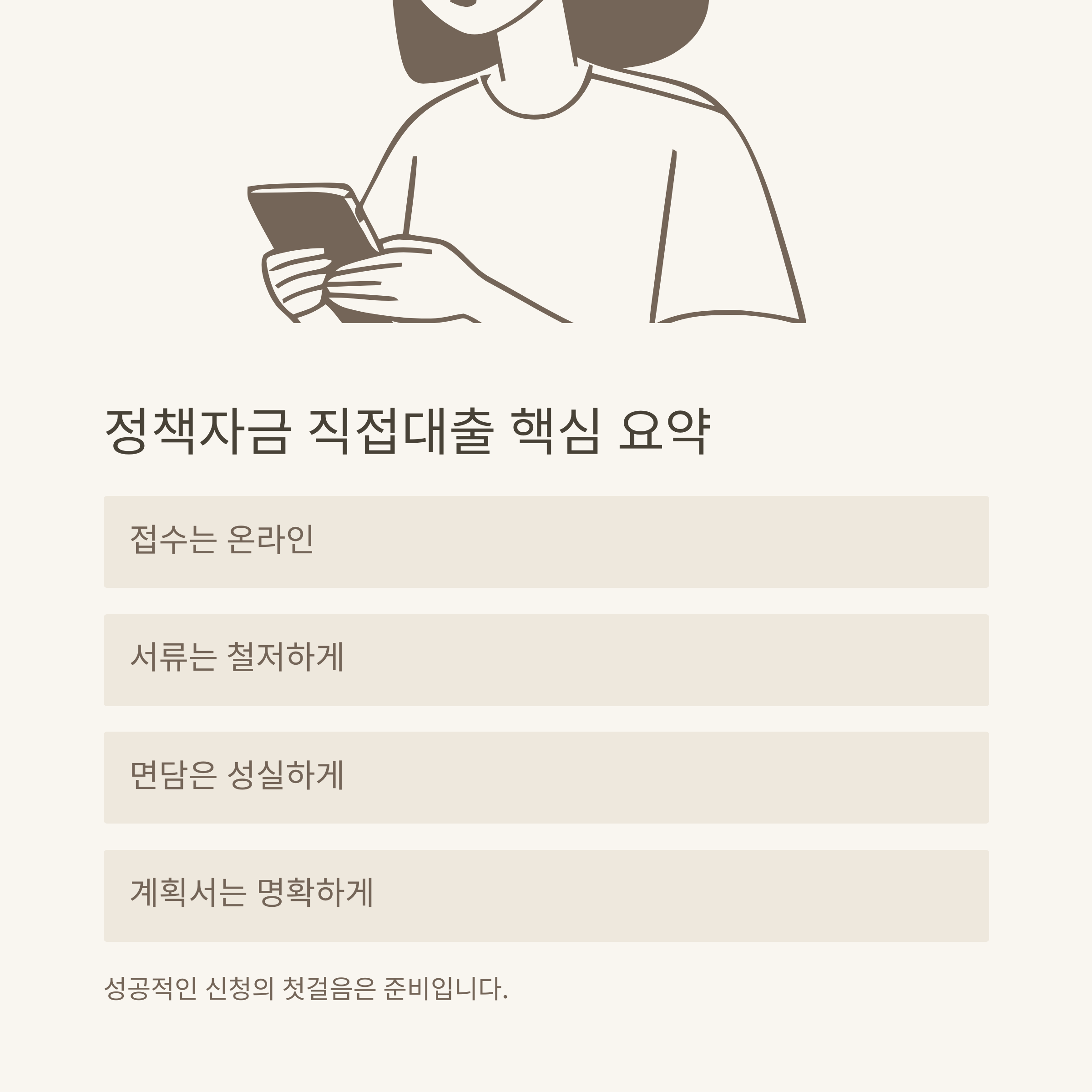 제가 실제로 정책자금 직접대출을 신청했던 경험을 기준으로, 신청 과정을 단계별로 정리해드릴게요. 대부분은 소상공인시장진흥공단 온라인 시스템을 통해 진행되며, 방문 없이 신청부터 서류 제출까지 모두 가능했습니다.