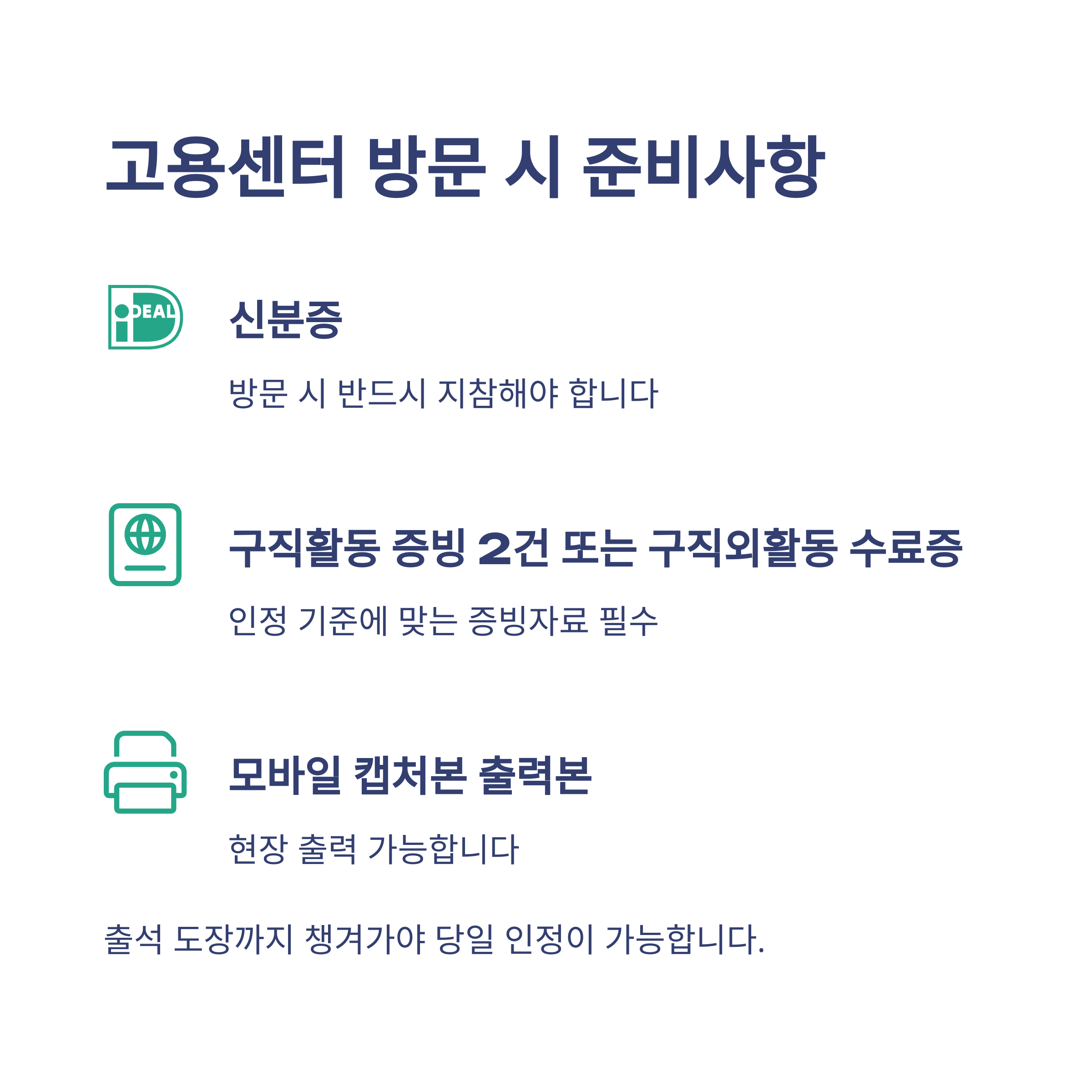 고용센터에서는 예약 없이도 접수는 가능했지만, 대기시간이 길었고 출석 확인 도장은 반드시 챙겨야 했어요. 서류를 하나라도 빠뜨리면 당일 인정이 안 될 수 있으니, 꼭 체크리스트로 준비하시길 추천드려요.