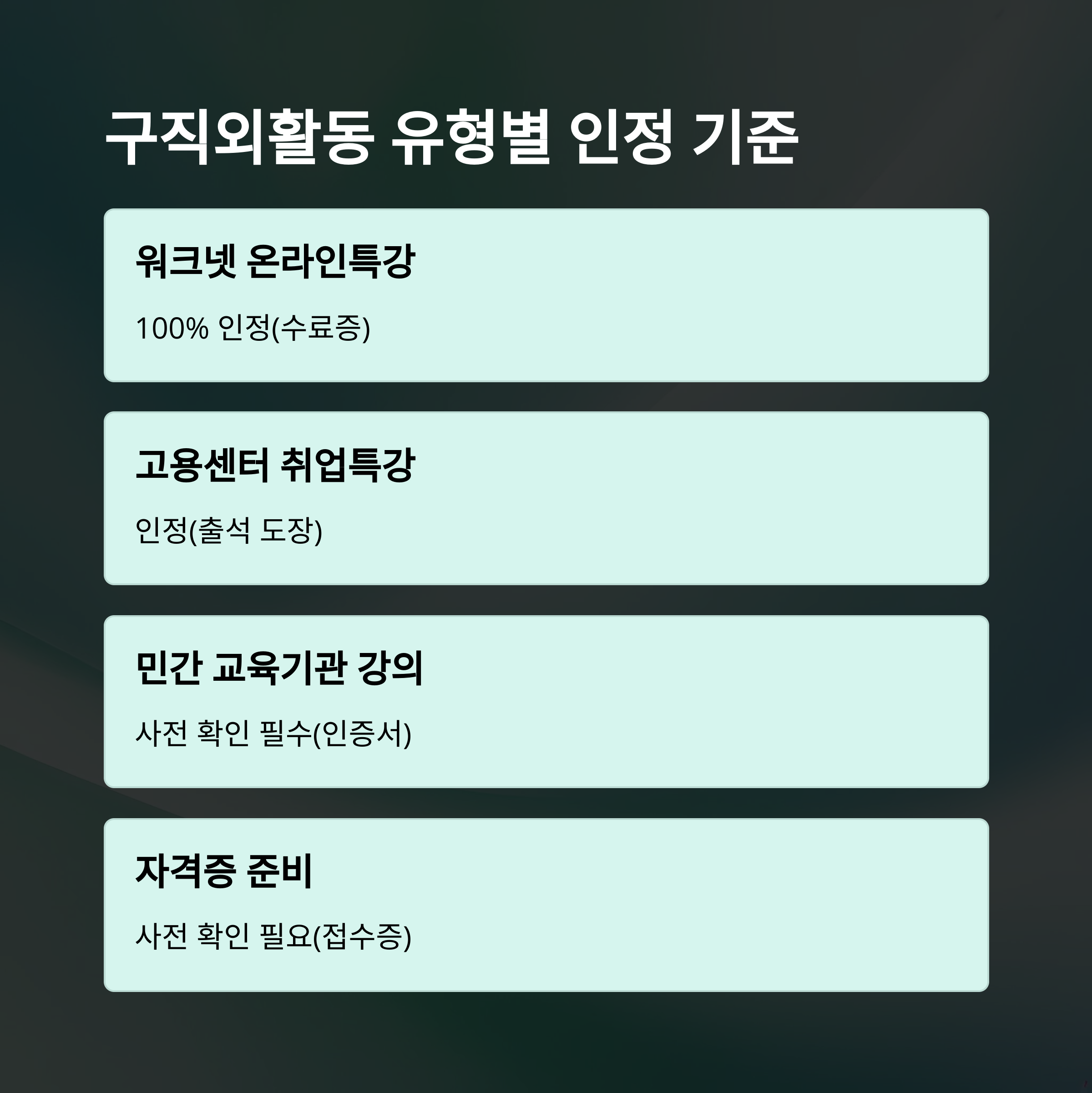 고용노동부 기준에 따르면 3차 실업인정은 구직활동 2건 또는 구직외활동 1건 이상으로 대체 가능하며, 이때 인정받을 수 있는 구직외활동은 제한적입니다. 예를 들어 워크넷 온라인 교육 수료, 고용센터 특강, 심리검사 등 공인된 활동만 인정돼요.