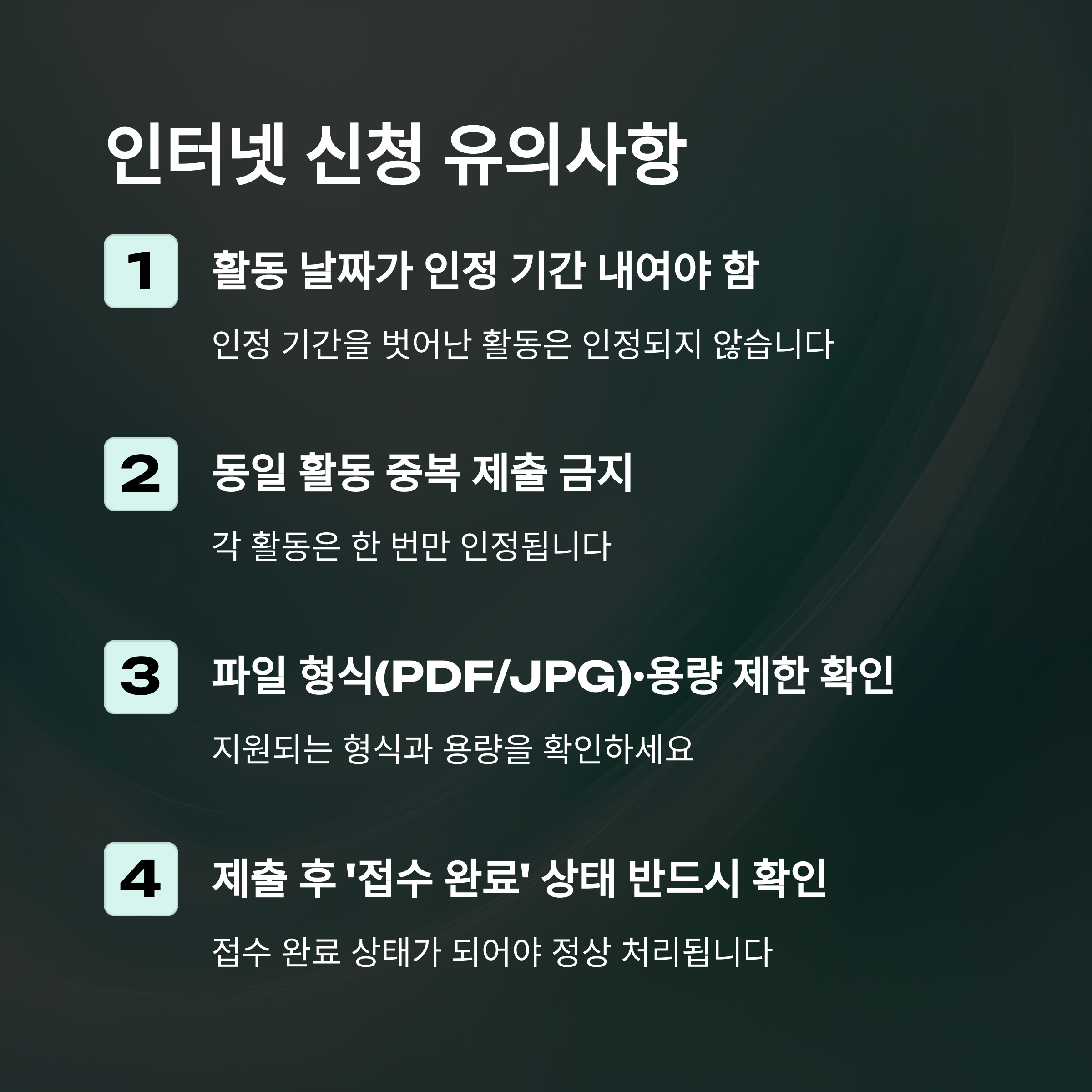 - 활동 날짜가 인정기간 내에 포함되어야 함