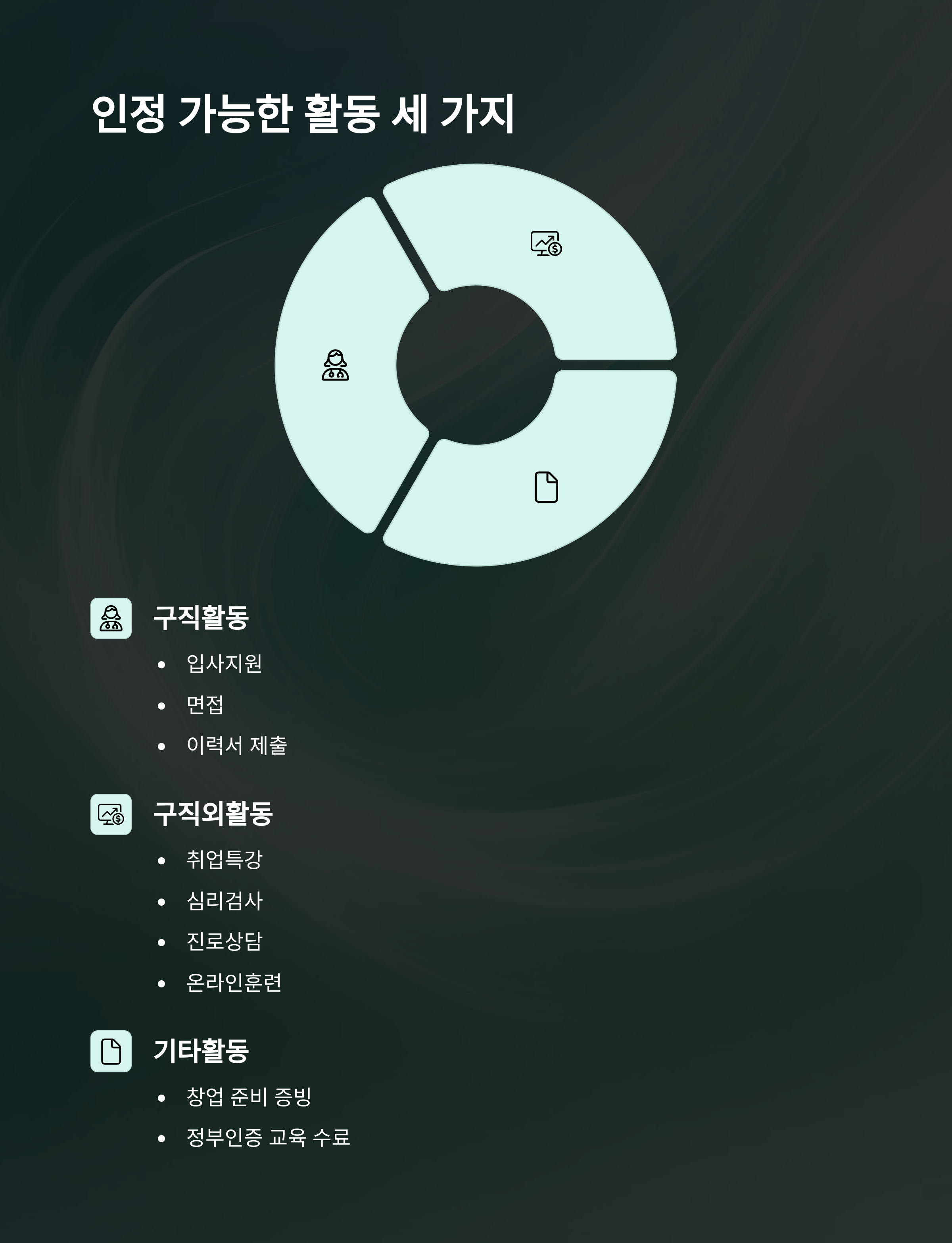 - 구직외활동: 취업특강, 심리검사, 진로상담, 온라인 직업훈련