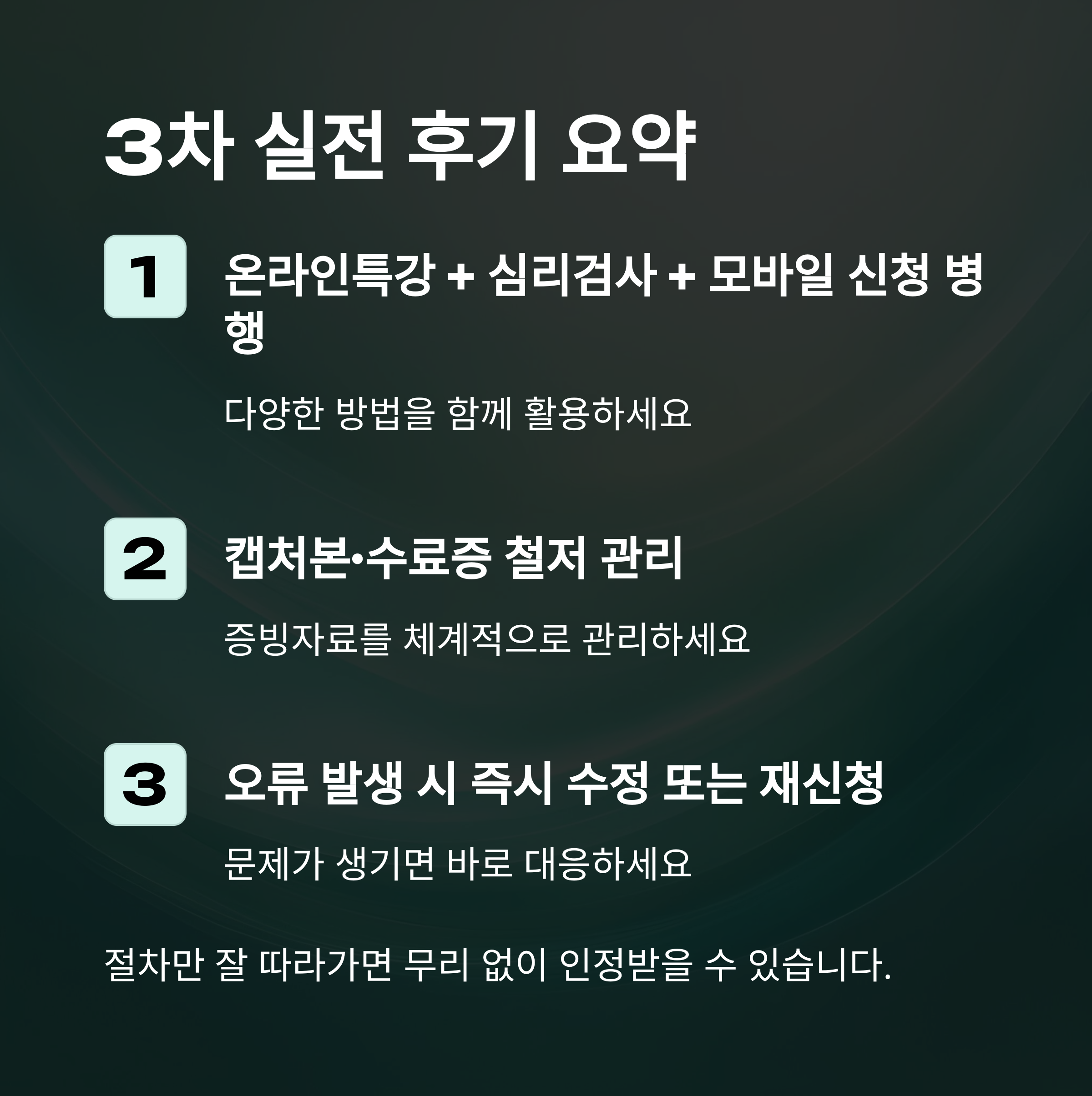 저는 워크넷 온라인특강을 기본으로, 심리검사도 병행하고, 모바일 신청을 시도하면서 시간 절약과 정확한 제출 모두 잡을 수 있었습니다. 특히 캡처본과 수료증을 철저하게 관리하니 제출할 때 한결 수월했어요.