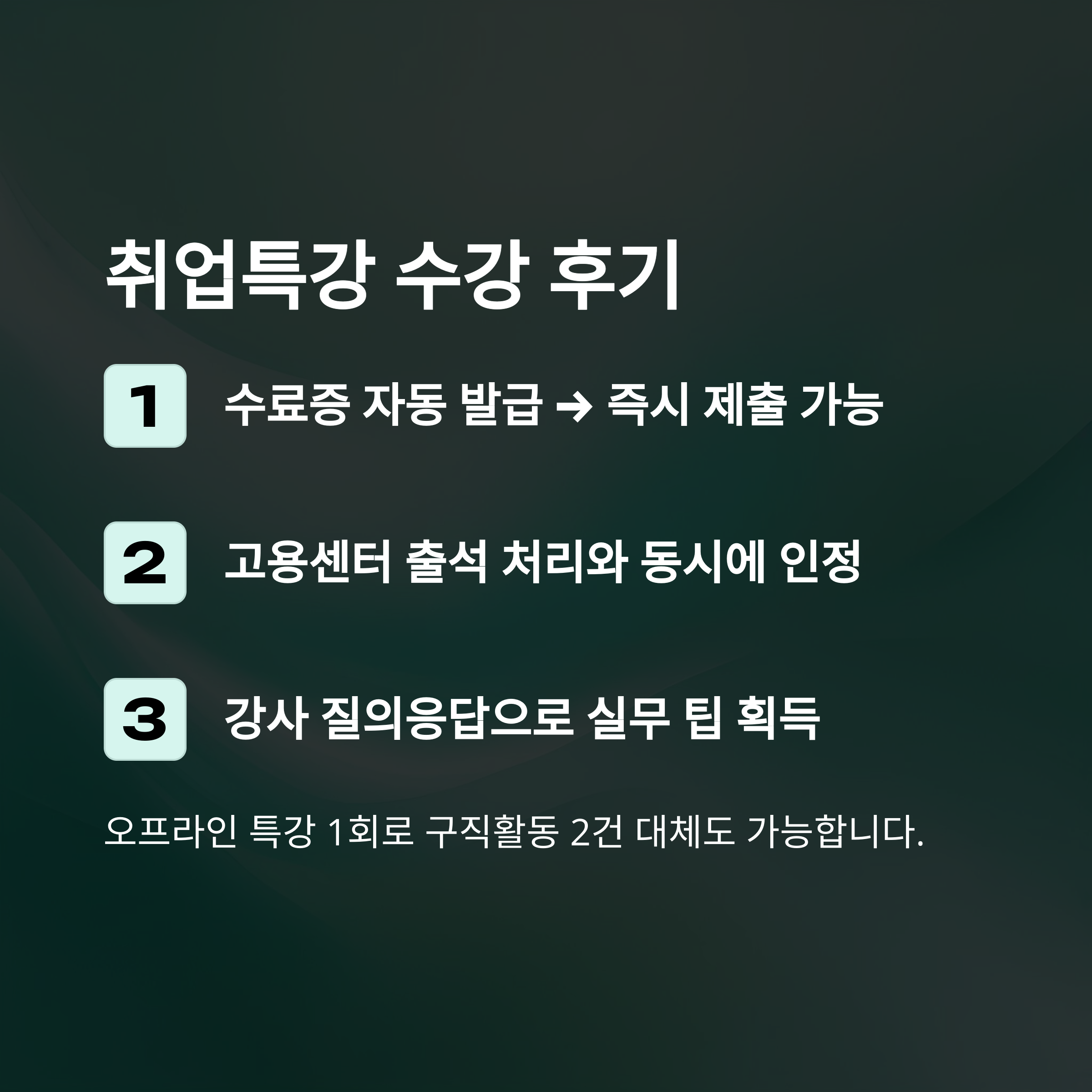 특히 이력서 피드백 코너는 실질적인 도움이 되었고, 특강만 수강해도 구직활동 2건을 대체할 수 있다는 점에서 시간 대비 효율이 높았습니다.