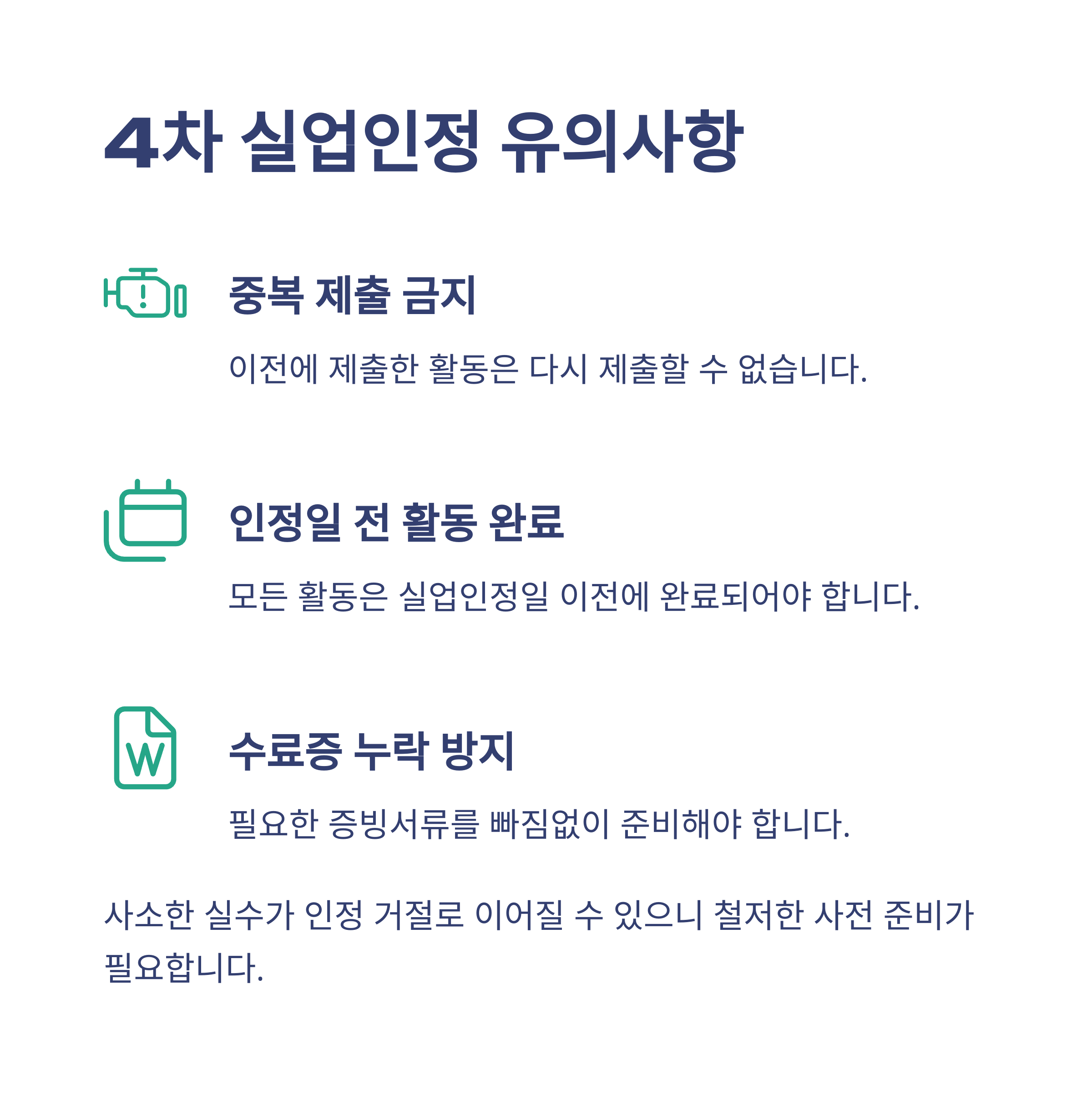 4차까지 오다 보면 구직활동 증빙에도 어느 정도 노하우가 쌓이긴 합니다. 그래도 한 번쯤 체크리스트를 정리해보는 게 좋겠다는 생각이 들었어요. 저는 실수로 동일 기업에 반복 지원한 걸 내밀었다가 인정 거절을 당한 경험이 있거든요.