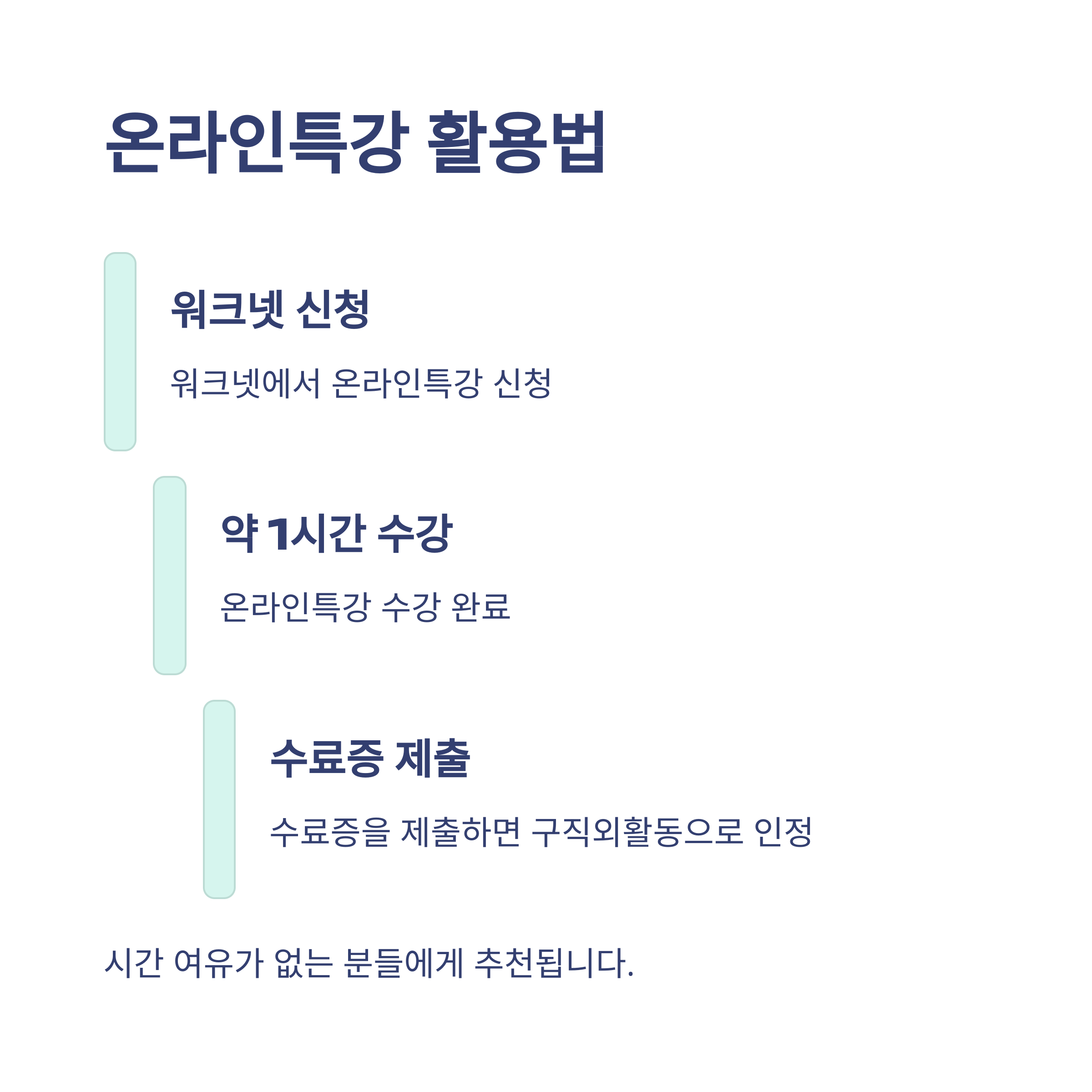 개인적으로 가장 편하게 실업인정을 받았던 방법이 온라인특강이었어요. 특히 4차에서는 구직외활동으로 이수한 특강 하나만으로도 인정이 되니까, 시간적 여유가 없는 분들에겐 정말 유용합니다.