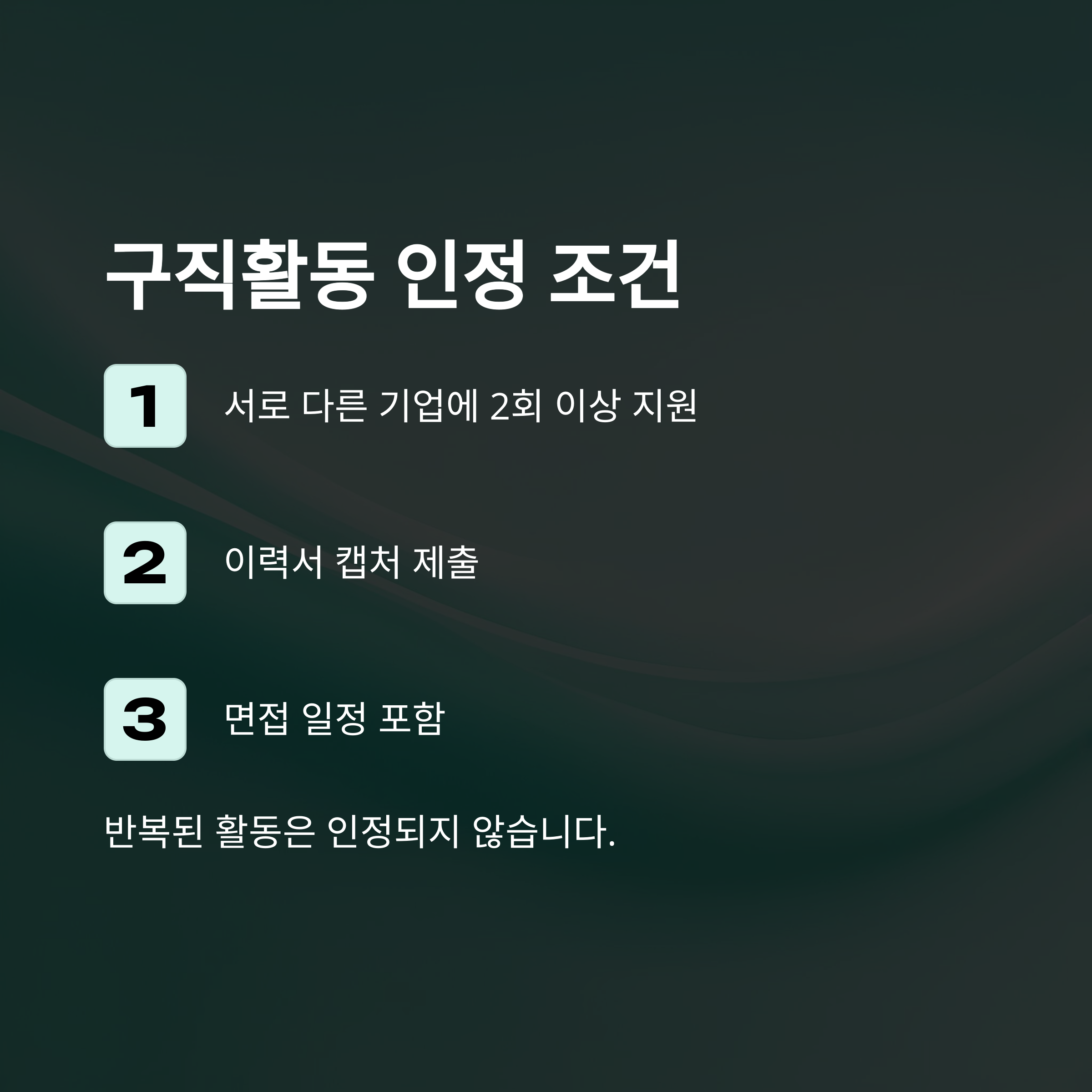 특히 구직활동은 고용센터 기준으로 단순 입사지원만으로는 인정되지 않는 경우도 있습니다. 가능한 다양한 직군, 업종에 걸쳐 시도하는 게 유리해요.