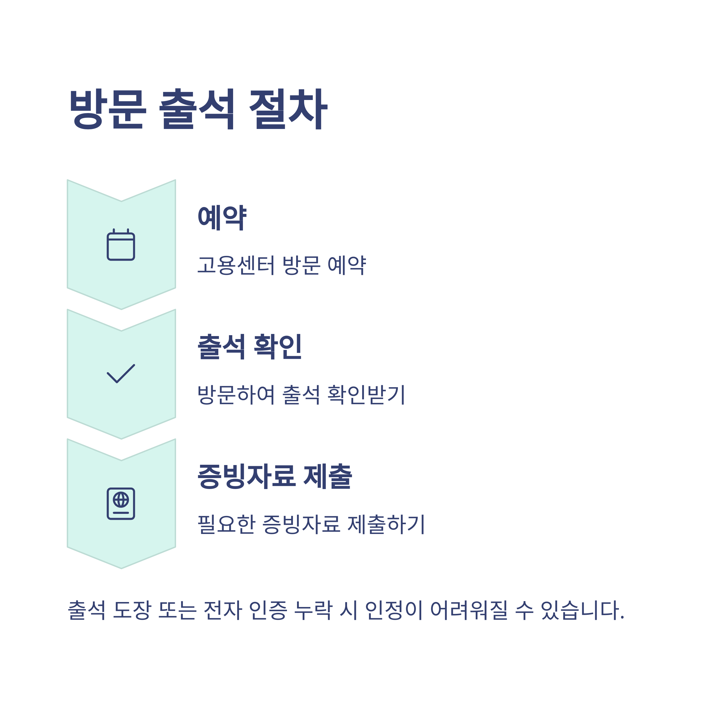- 출석 후 대기 → 상담 → 서류 확인 → 활동증빙 제출