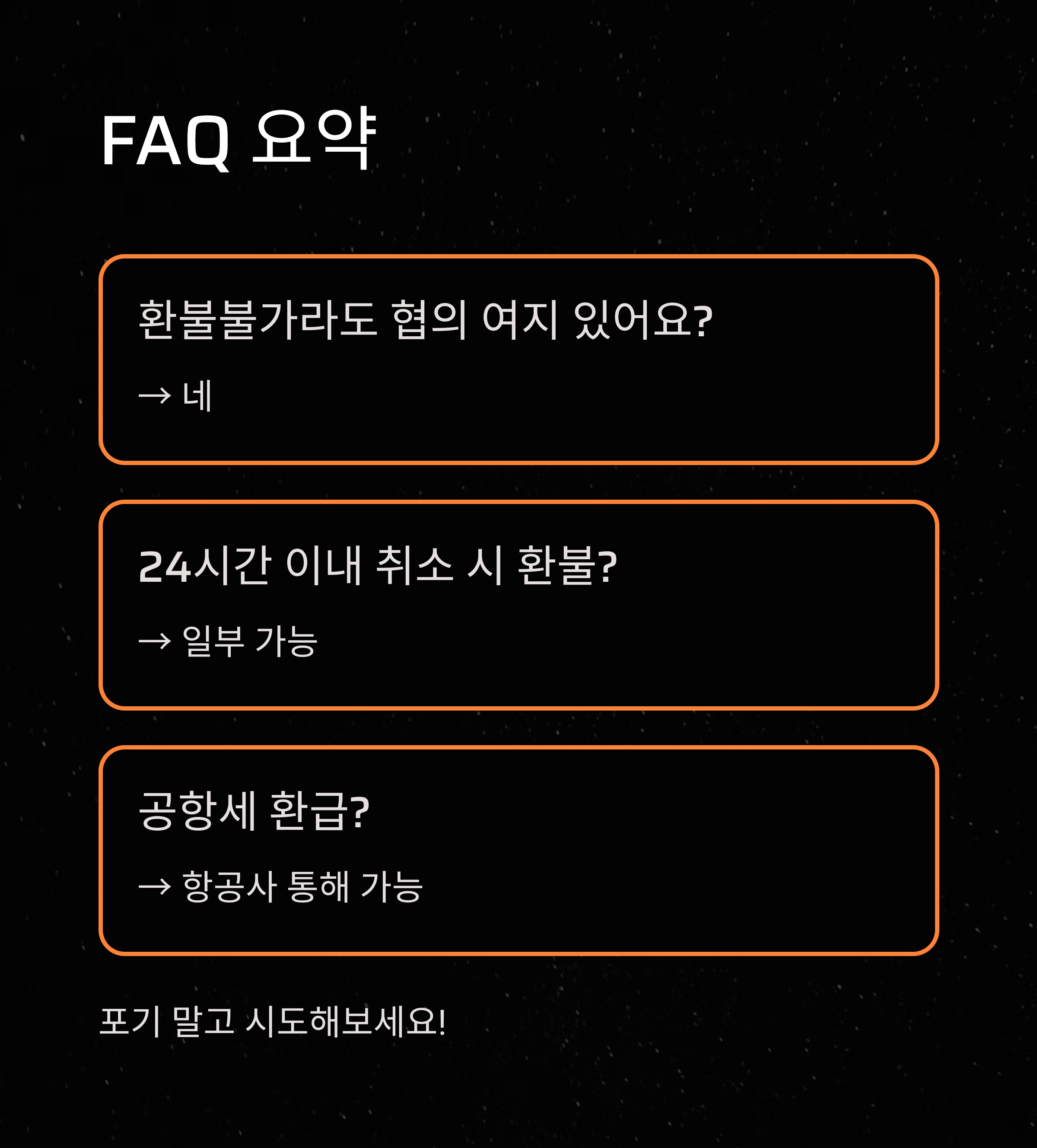 | 항공권 취소 | 환불불가 시 공항세·유류세는 일부 환급 가능, 항공사 통해 직접 신청 |