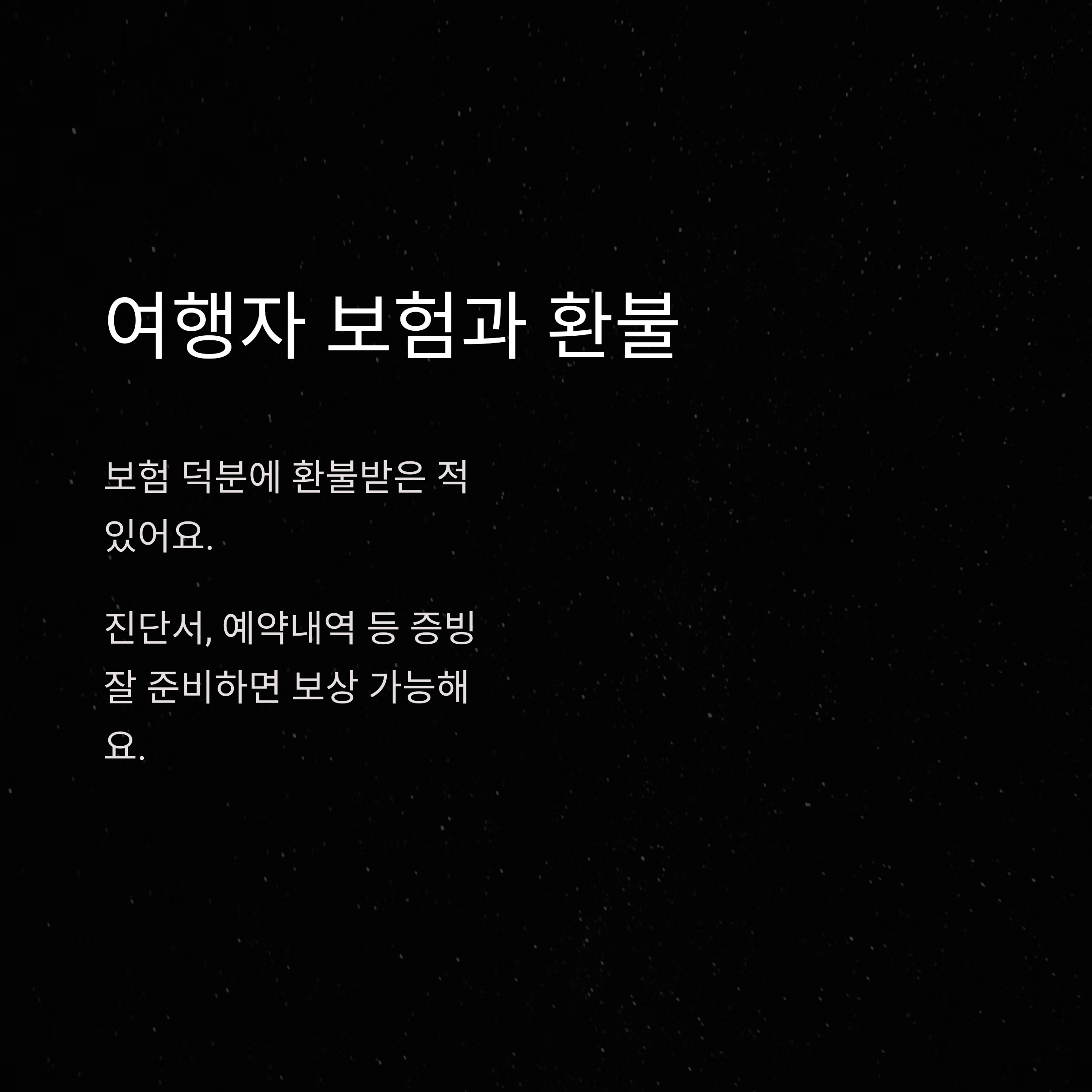 그 외에도 ‘여행자 보험’에 환불 보장이 포함되어 있다면, 진단서 등 증빙자료로 보험금을 받을 수도 있으니 꼭 약관을 읽어보세요.