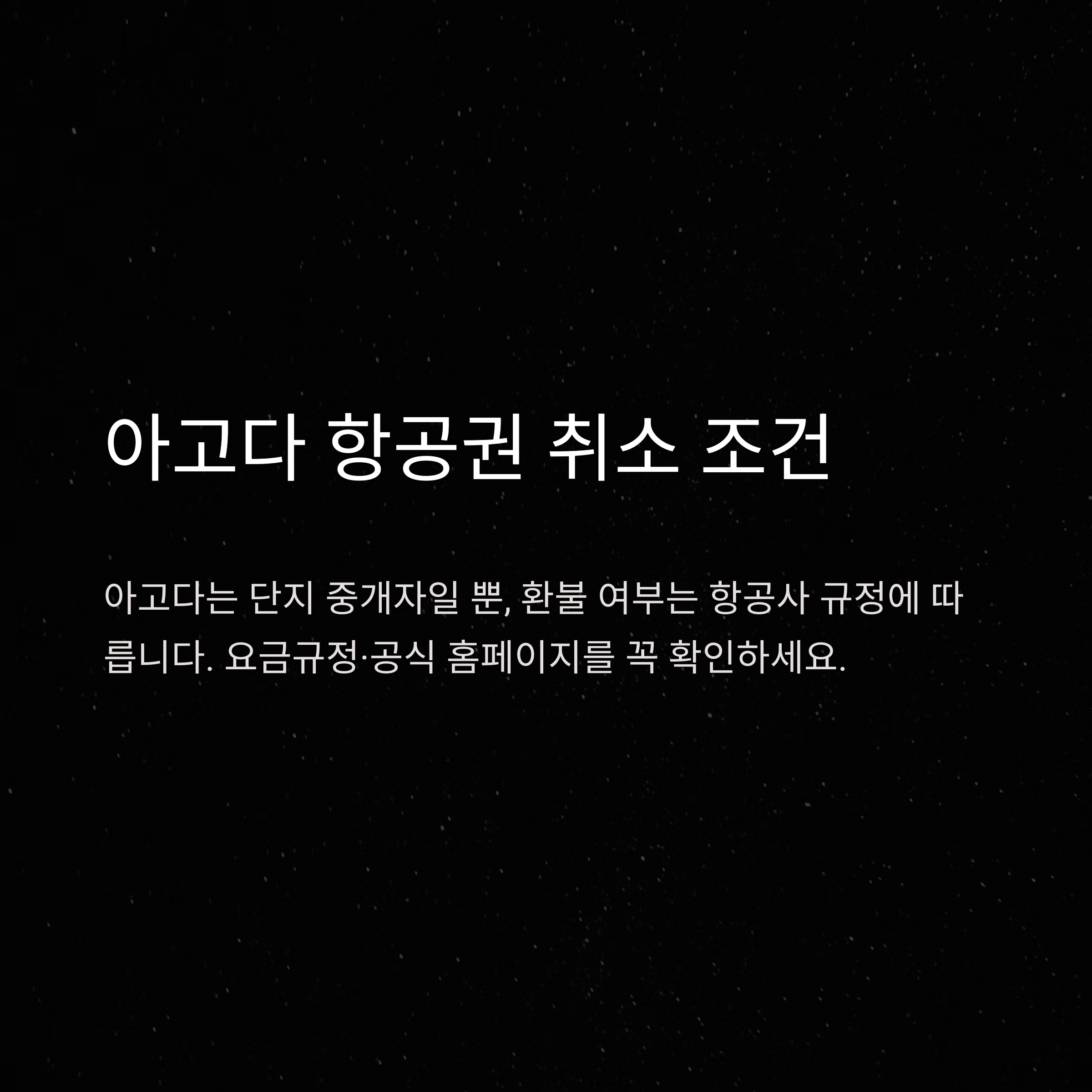 저는 아고다에서 ‘환불불가 항공권’을 예약한 뒤, 급작스러운 출장으로 피치 못하게 취소한 적이 있습니다. 이때 아고다에서는 “항공사 규정에 따라야 한다”며 직접 항공사에 연락하라고 안내했습니다.
