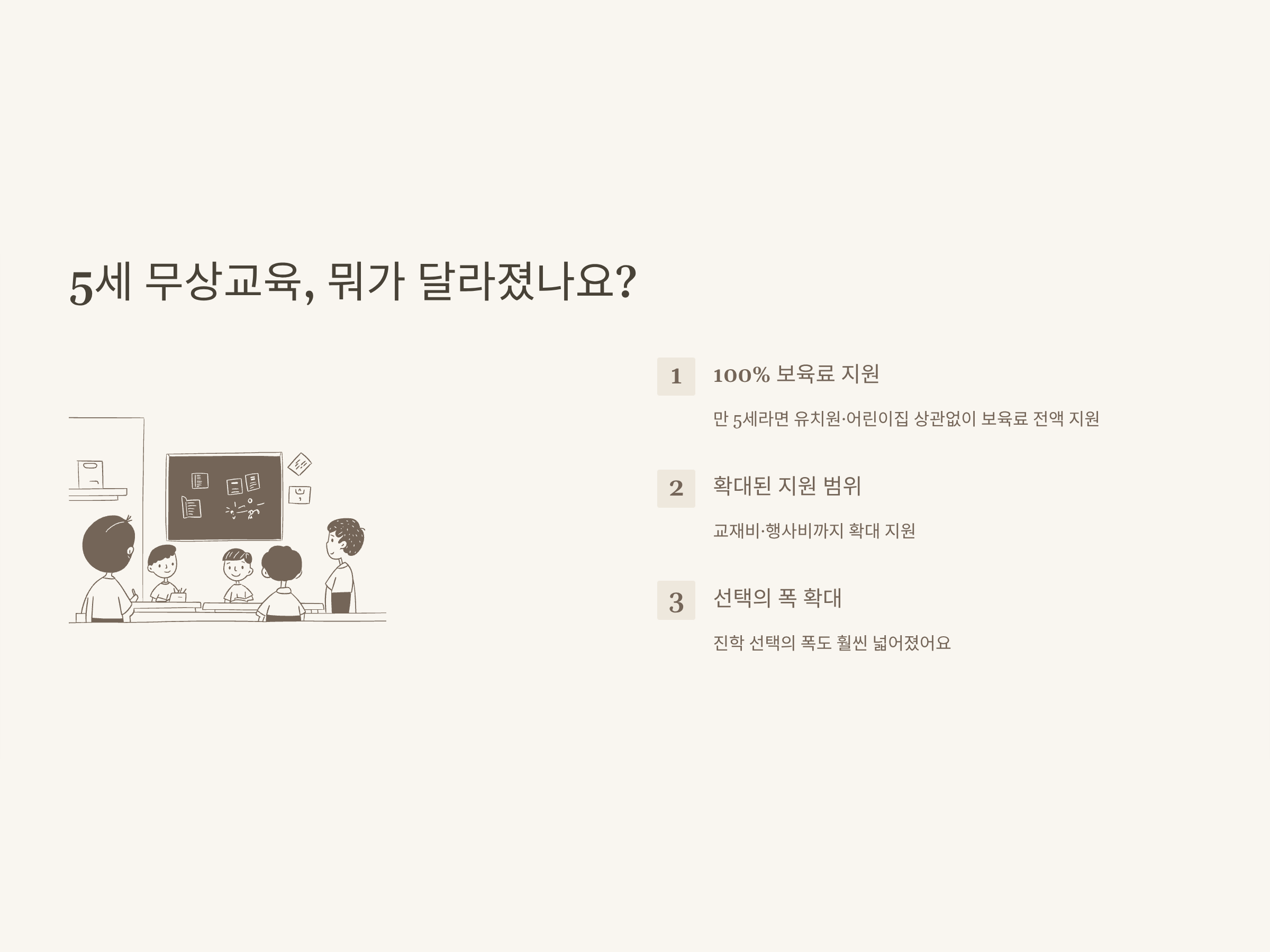 정부 공식 정책 발표(정부 정책뉴스)에 따르면 2025년엔 부모 소득 무관, 만 0~5세 전체 무상교육이 더욱 강화될 예정입니다.