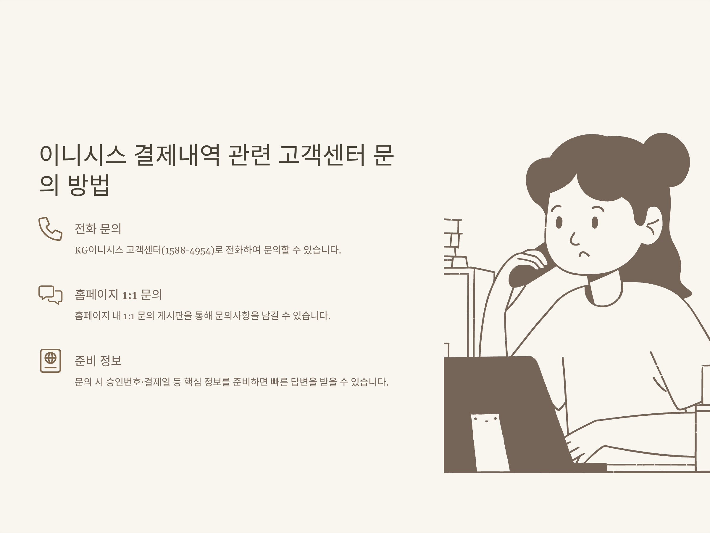 이니시스 결제와 관련해 궁금하거나 문제가 생기면 KG이니시스 고객센터를 통해 문의할 수 있습니다. 저 역시 결제내역 조회 오류, 승인번호 분실, 메일 미수신 등으로 여러 번 문의를 해봤는데, 대부분 빠르게 답변을 받을 수 있었습니다. 단, 환불·취소와 같은 요청은 반드시 실제 결제한 가맹점(쇼핑몰/서비스)으로 먼저 연락하셔야 처리가 가능합니다.