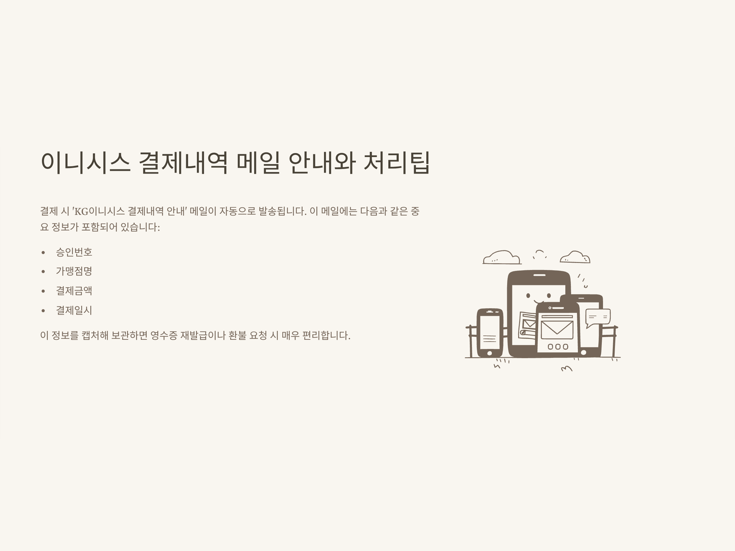 - 메일 제목은 ‘KG이니시스 결제내역 안내’ 또는 ‘결제완료 안내’ 등으로 옴