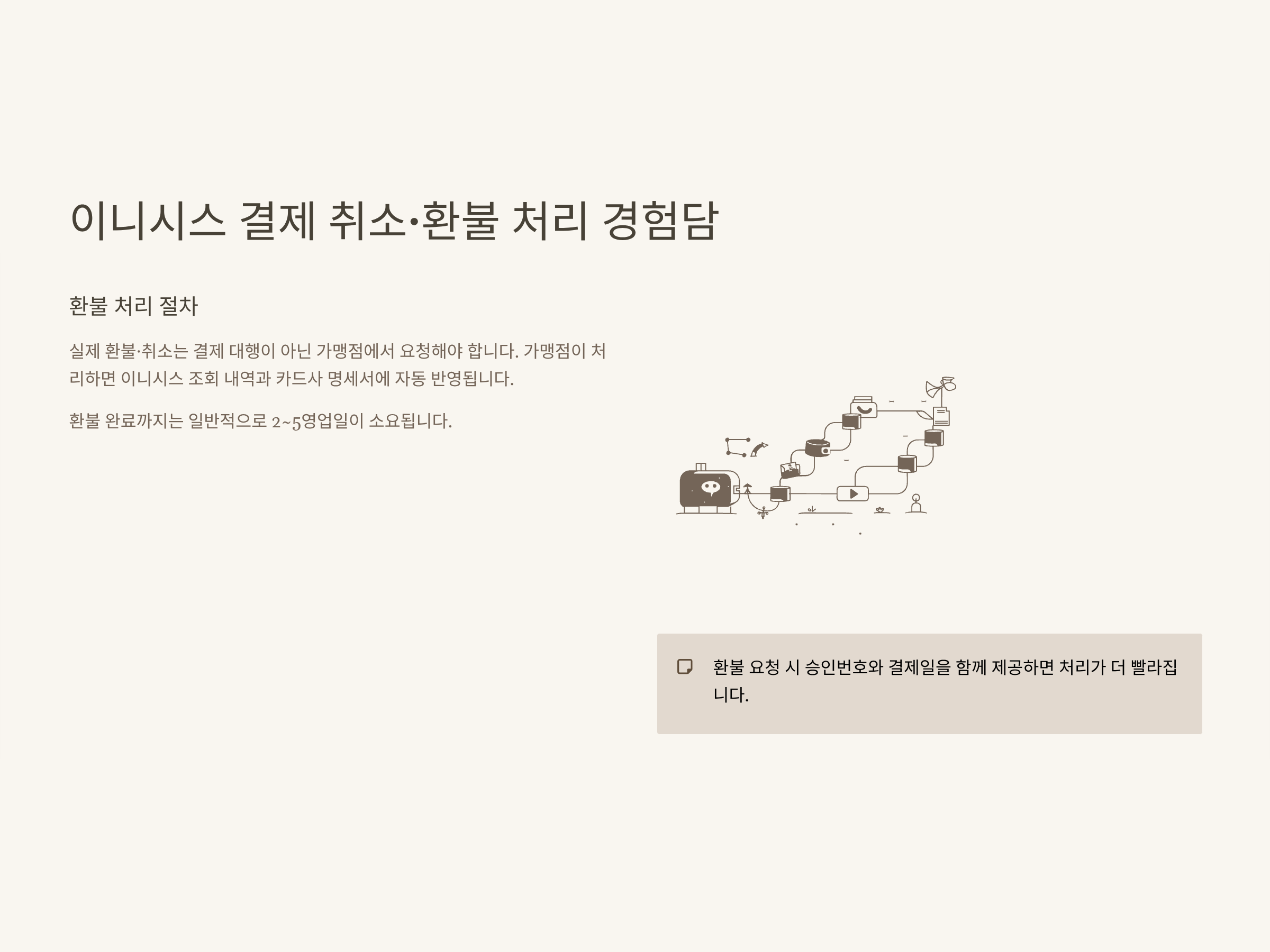 - 가맹점이 환불 처리하면 이니시스 내역·카드사 명세서에도 자동 반영