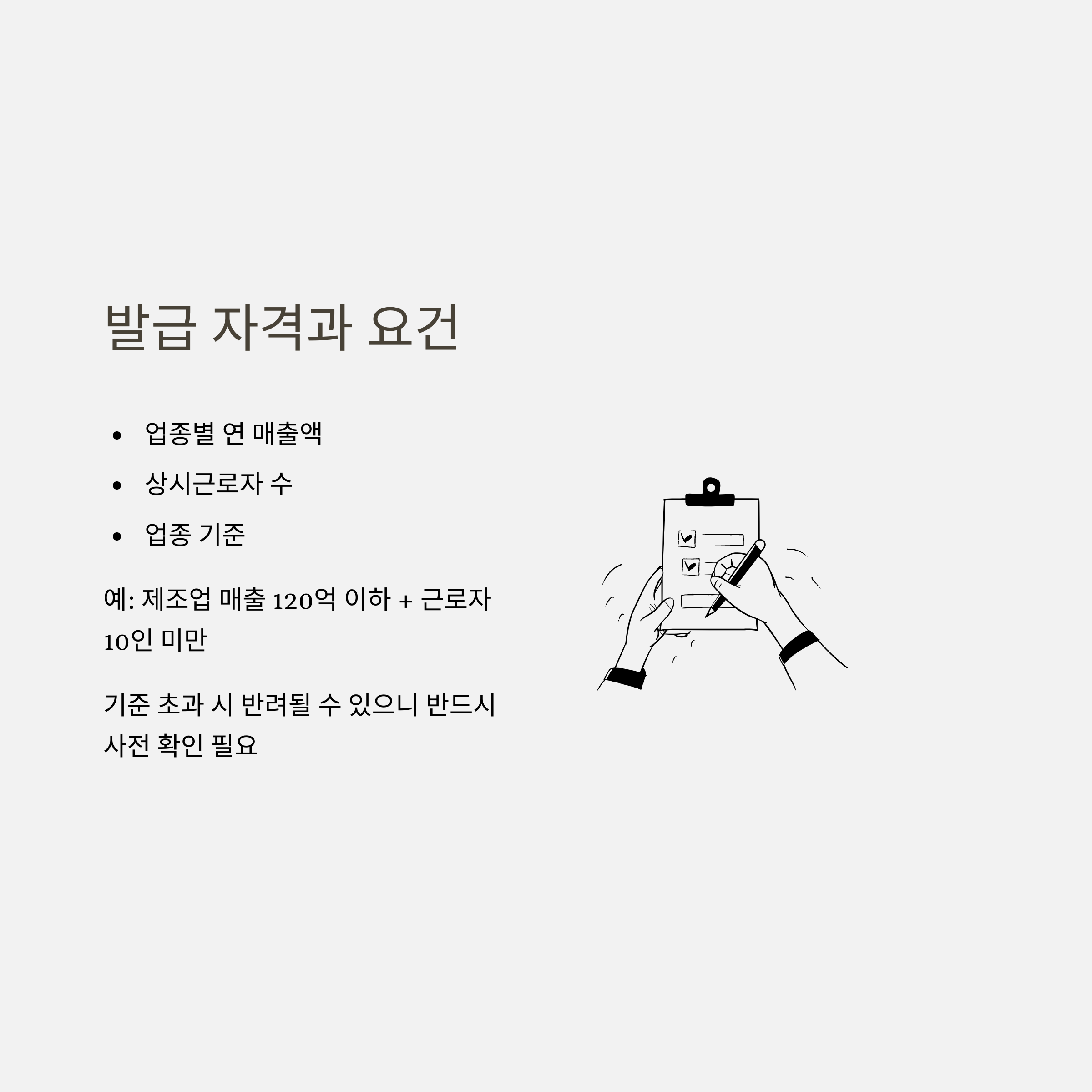발급 자격 및 요건은 사업자등록을 보유한 개인/법인 사업자 중 매출액, 상시근로자 수, 업종(한국표준산업분류)에 따라 소기업 또는 소상공인 기준을 충족해야 합니다. 일반적으로 아래 조건 중 하나라도 벗어나면 발급이 어렵습니다.